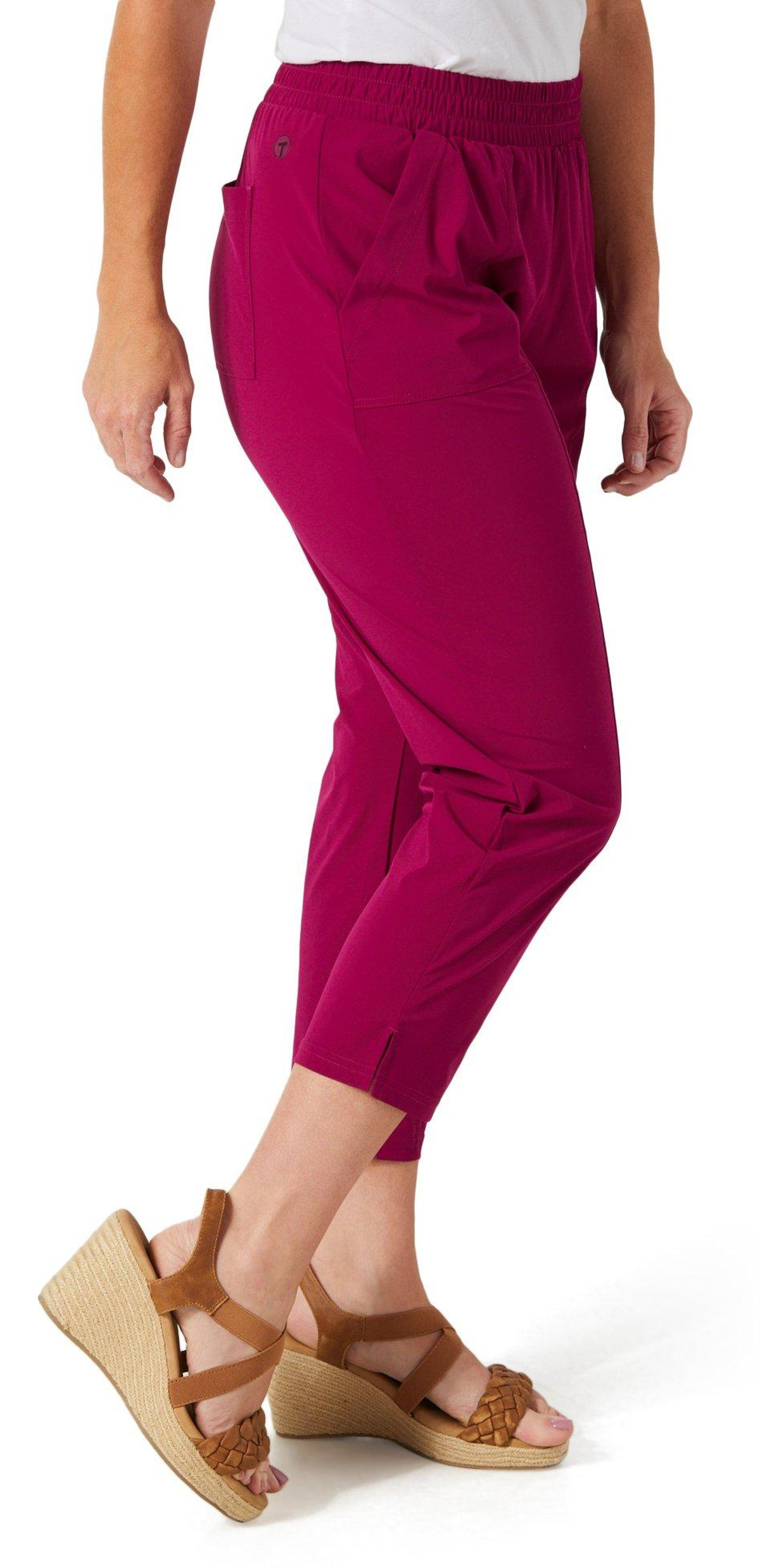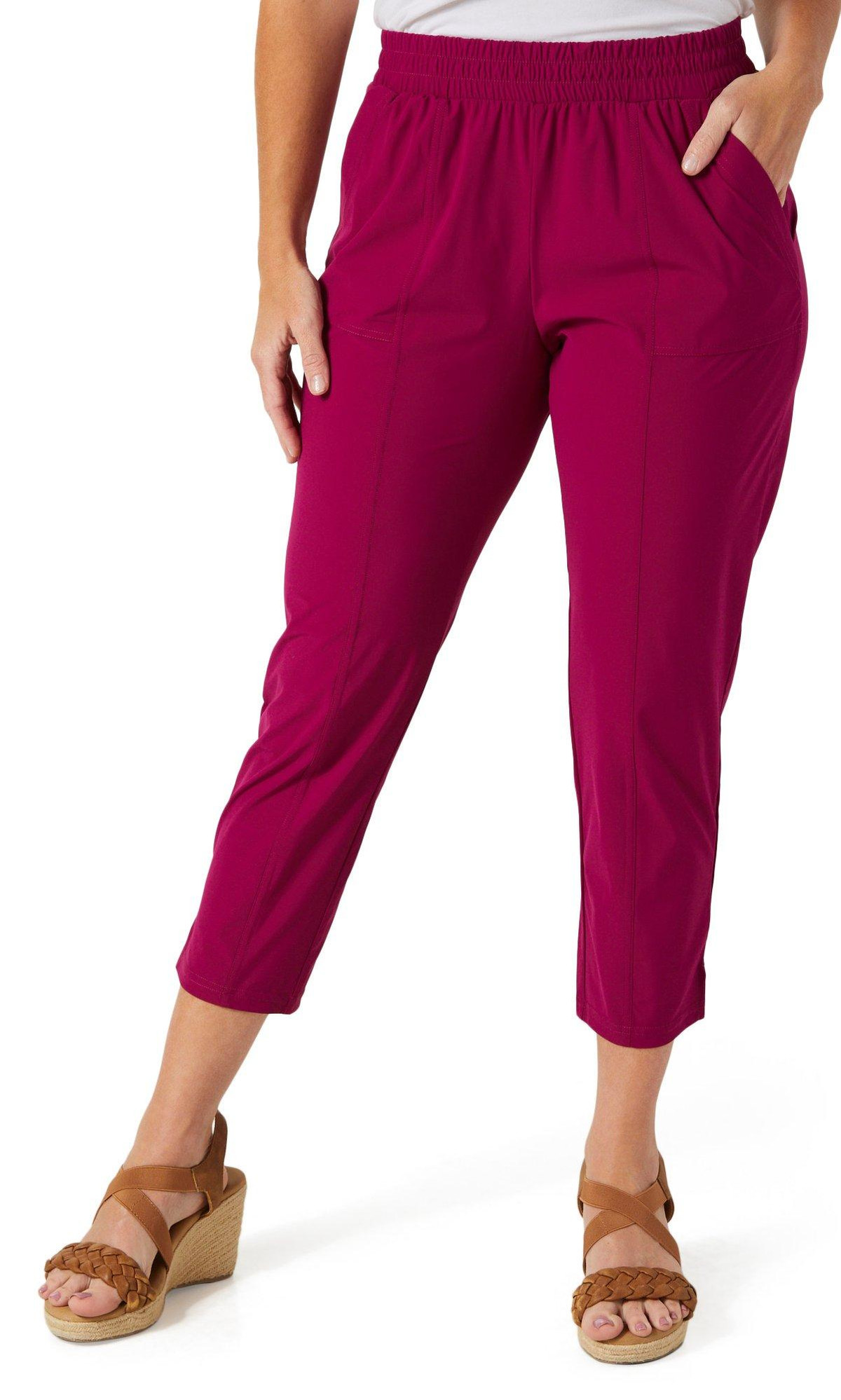 These womens active pull on tech pants offer sleek comfort with a solid color design and a 25 inch inseam. Featuring an elastic waistband and side seam pockets they are perfect for movement and everyday wear.