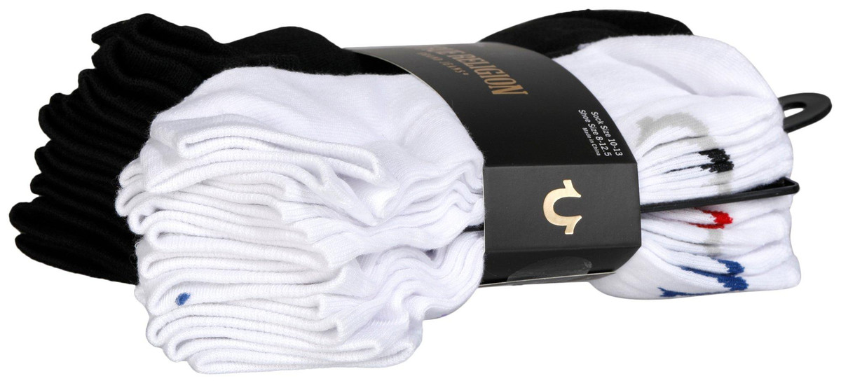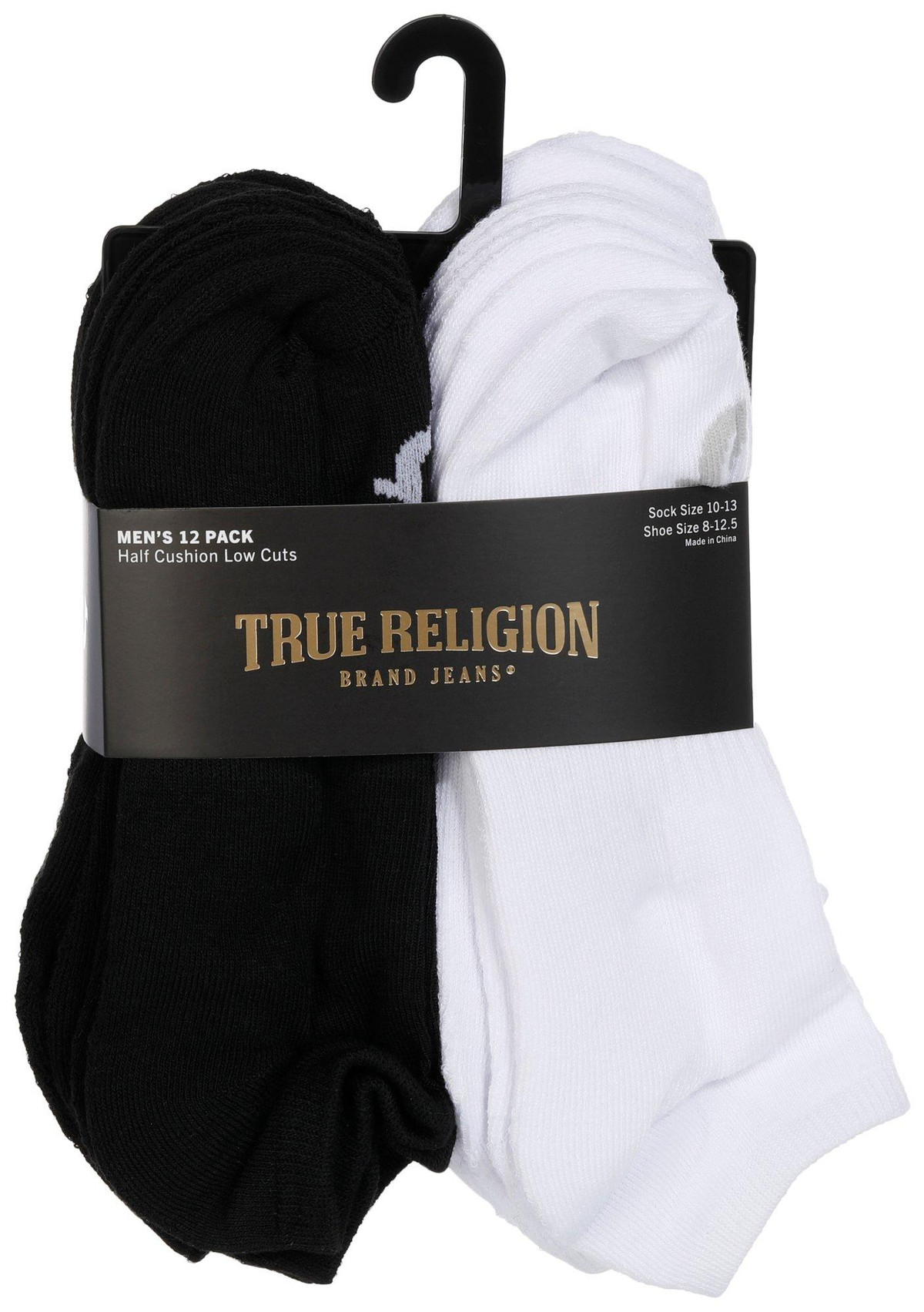 True Religion Men’s 12-Pair Half Cushion Low Cut Socks in black and white offer comfort and style for everyday wear. Designed with breathable fabric and soft half cushioning, theyre perfect for workouts or casual use. The low cut design stays hidden under sneakers, and they fit mens shoe sizes 812.5. Durable, machine washable, and built to last.