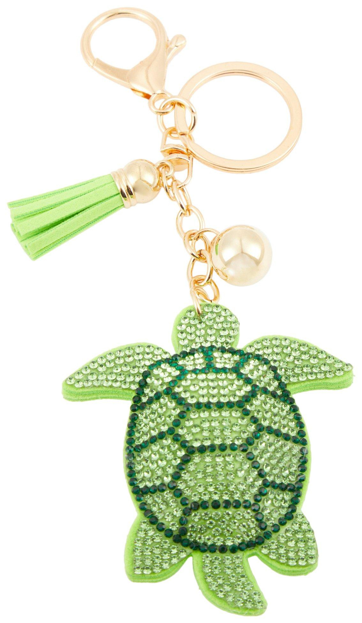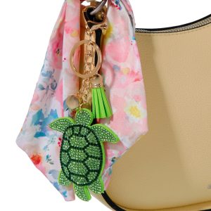 Add a touch of ocean charm with the Turtle Bag Charm. Featuring a sparkling rhinestone exterior and a gold lobster clasp, this 3-inch accessory brings a whimsical, sea-inspired flair to your favorite bag or keychain.