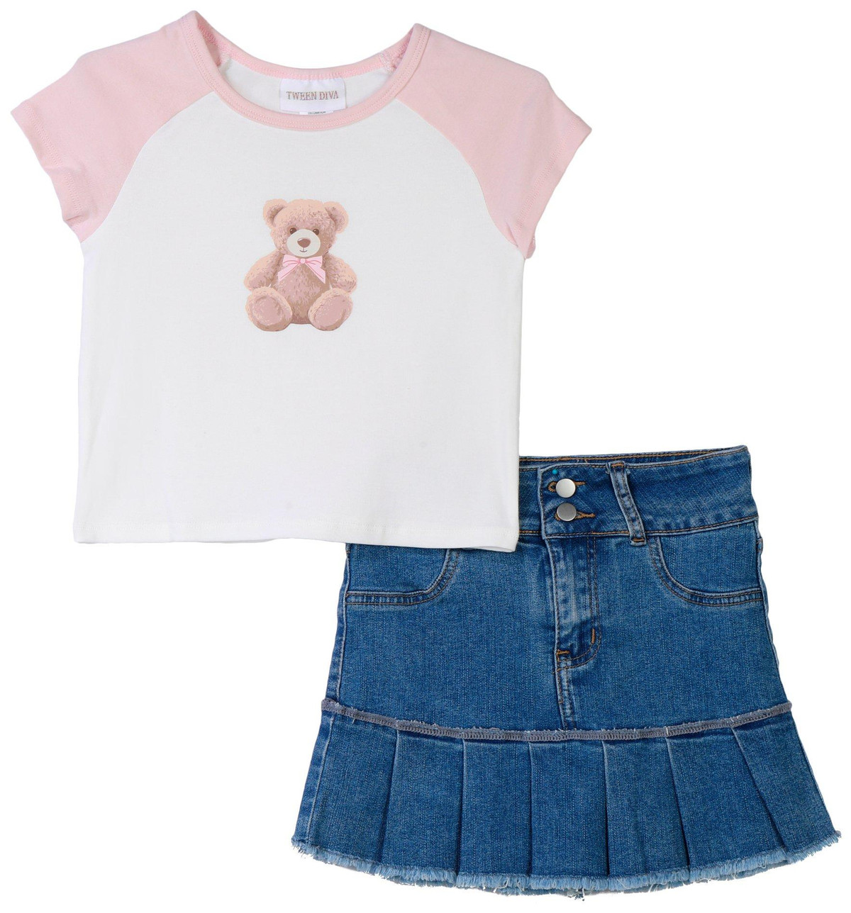 This two piece set for little girls includes a white crew neck tee with short pink sleeves and a cute teddy bear print. Paired with a denim skirt featuring built in biker style shorts for added comfort and coverage. Faux front pockets add a stylish touch to this playful and practical outfit.
