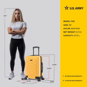 The U.S. ARMY FOX Collection 20 in. Carry-On is a tribute to the bravery and strength of the U.S. Army. Crafted for both durability and style in mind, this suitcase features a lightweight hard-flex shell, and is scratch-resistant. It glides on four double multi-directional spinner wheels for effortless mobility and has a fully lined interior with a zippered compartment on one side and snap-on elastic cross straps on the other. Measures 14.17 in. x 8.66 in. x 21.85 in.