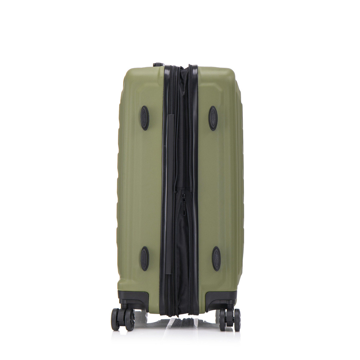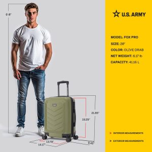 The US ARMY FOX Pro Collection 20 in. Carry-On suitcase is a tribute to U.S. Army bravery and strength. It is perfect for short or overnight trips or as a cabin bag to supplement your checked baggage and keep your important possessions accessible. Crafted with a durable hard shell, it features a spacious, organized interior, smooth-gliding spinner wheels, and cushioned handles. The FOX Pro also includes an expandable zipper and a built-in TSA-accepted lock. Measures 14.17 x 9.45 x 21.85.