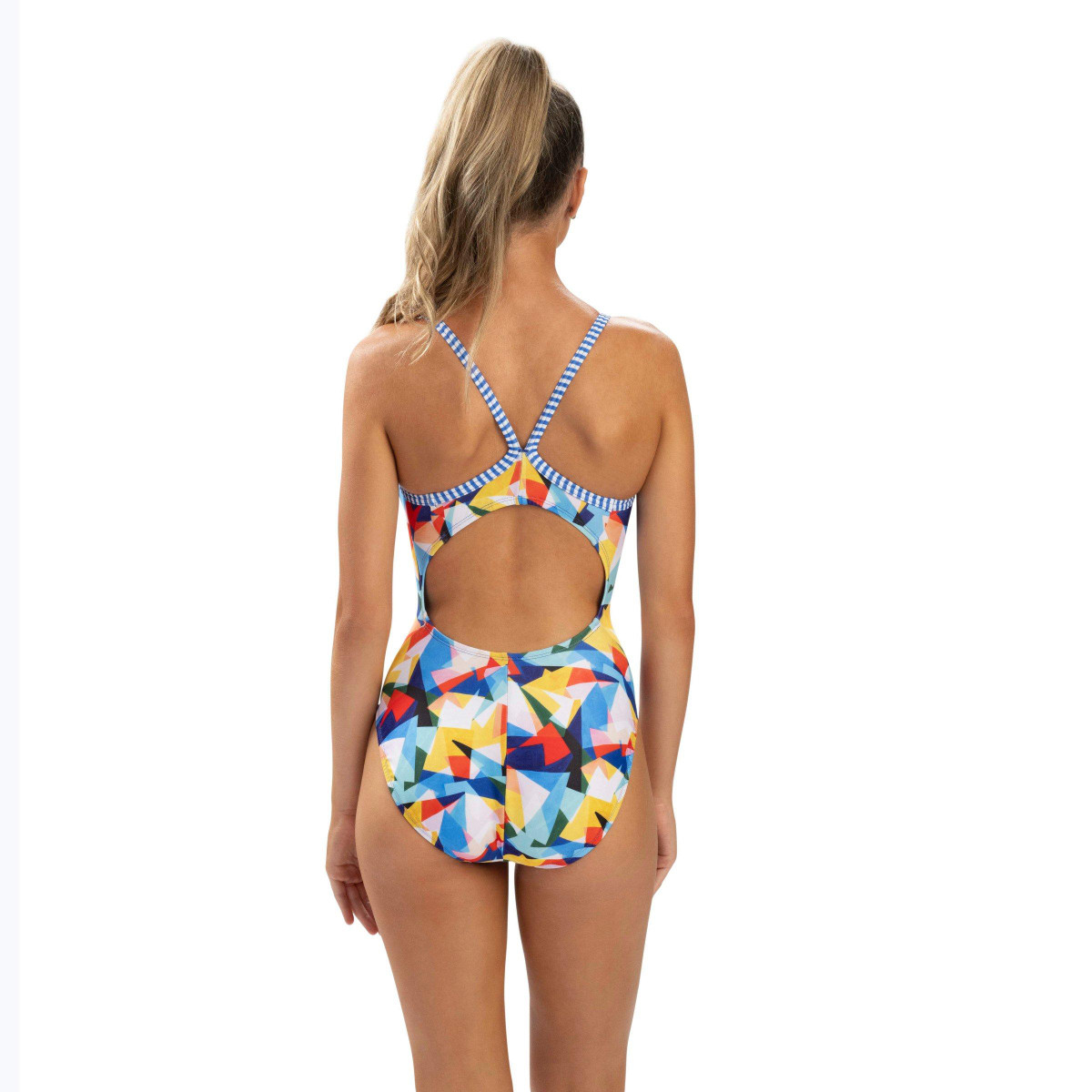 Make a bold statement in the Uglies Impact V-Back One Piece, featuring an eye-catching, overlapping, geometric print in vibrant primary tones. Designed for swim training, this suit offers chlorine resistance, color retention, and UPF 50+, ensuring it looks as fresh as it feels. With its sleek V-back cut, youll experience reduced drag and full range of motion, perfect for powering through every lap.
