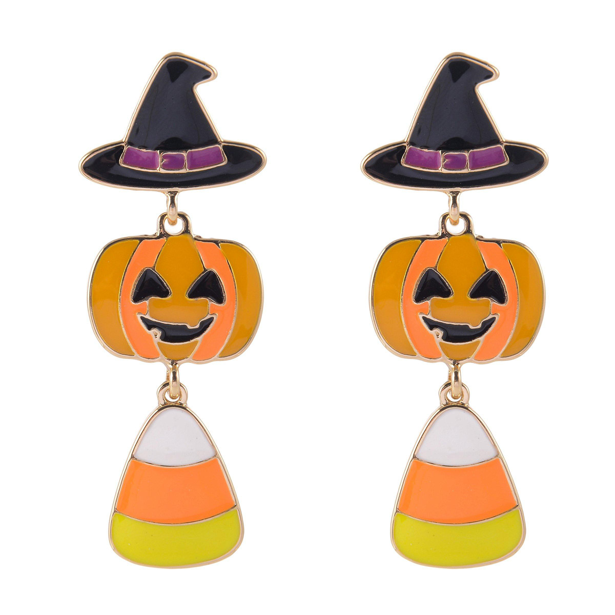 Double the sweet and double the spell the Candy Corn Pumpkin Witch Halloween Earrings serve up festive flair with a twist of enchantment. Each pair features candy corn charm with pumpkin personality topped off by a tiny witch hat that says spooky season in style. Rhinestone sparkle adds a dash of mischief while their lightweight design keeps things comfy from first treat to final trick.