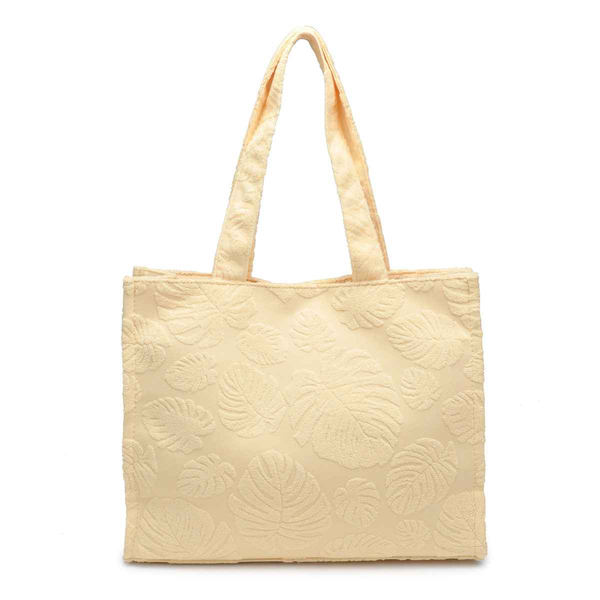 This beach tote features a fun beachside bliss print, dual strap handles, exterior slip pockets, a zipper closure, and an interior pocket. Perfect for the beach or lounging by the pool.