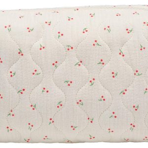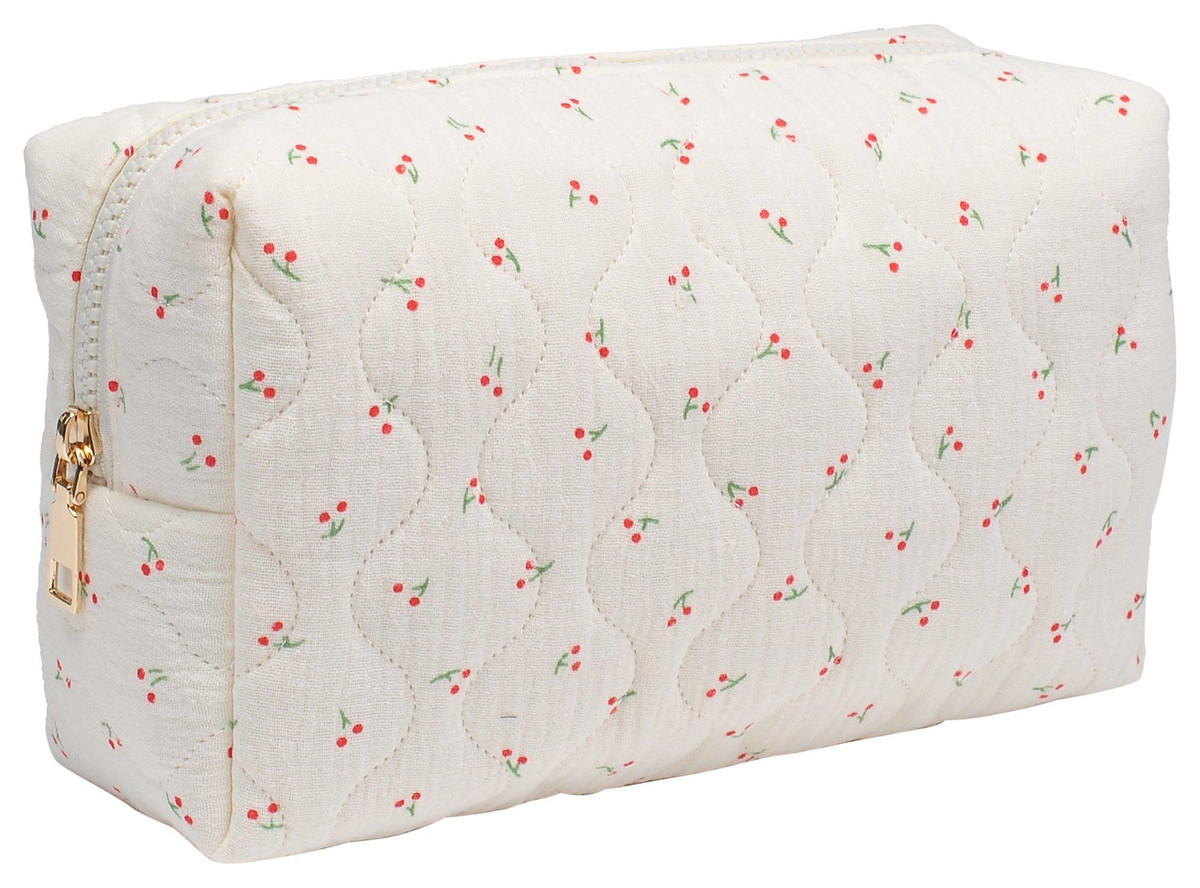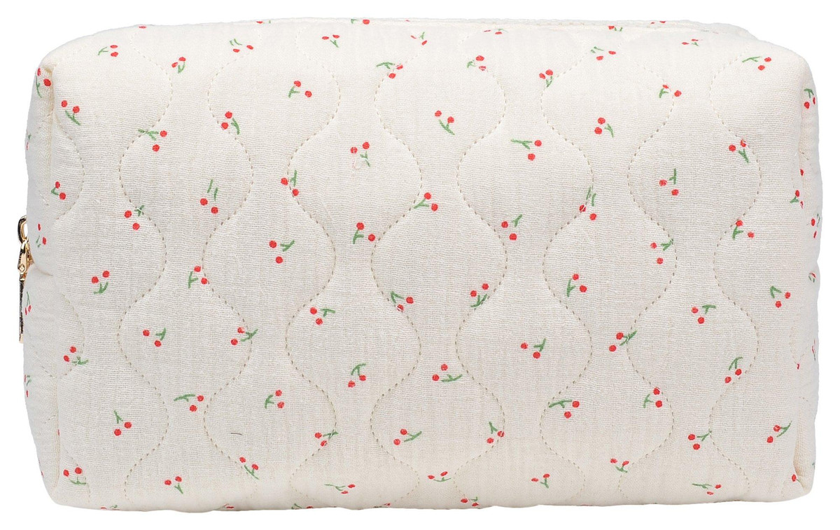 Quilted printed cherry Patten , zipper pouch, great for cosmetics. Measures: 8.25 x x 3 x 5.13 Inches