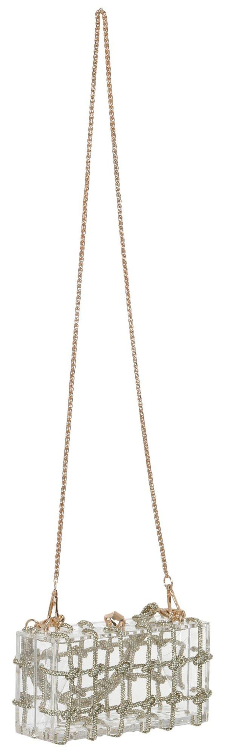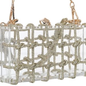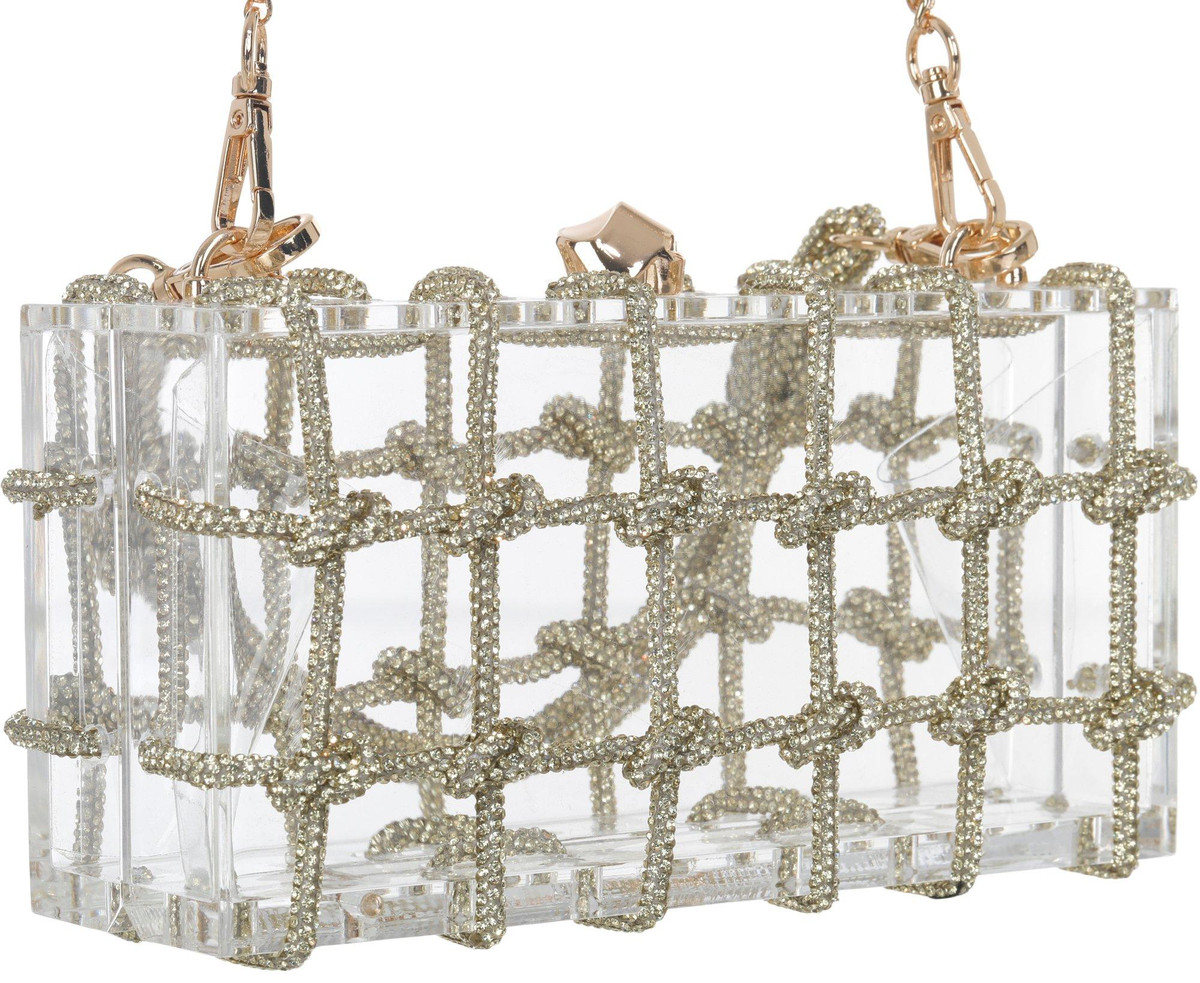 Shine bright with our Clear Acrylic Ziggy Evening Bag. This stunning accessory features removable handles for versatile styling and a clip top closure to keep your essentials secure. The rhinestone accents add a touch of glamour, making it the perfect statement piece for any evening event. Elevate your look with this chic and eye-catching evening bag. Measures approximately 2.5 in x 4 in x 8 in.