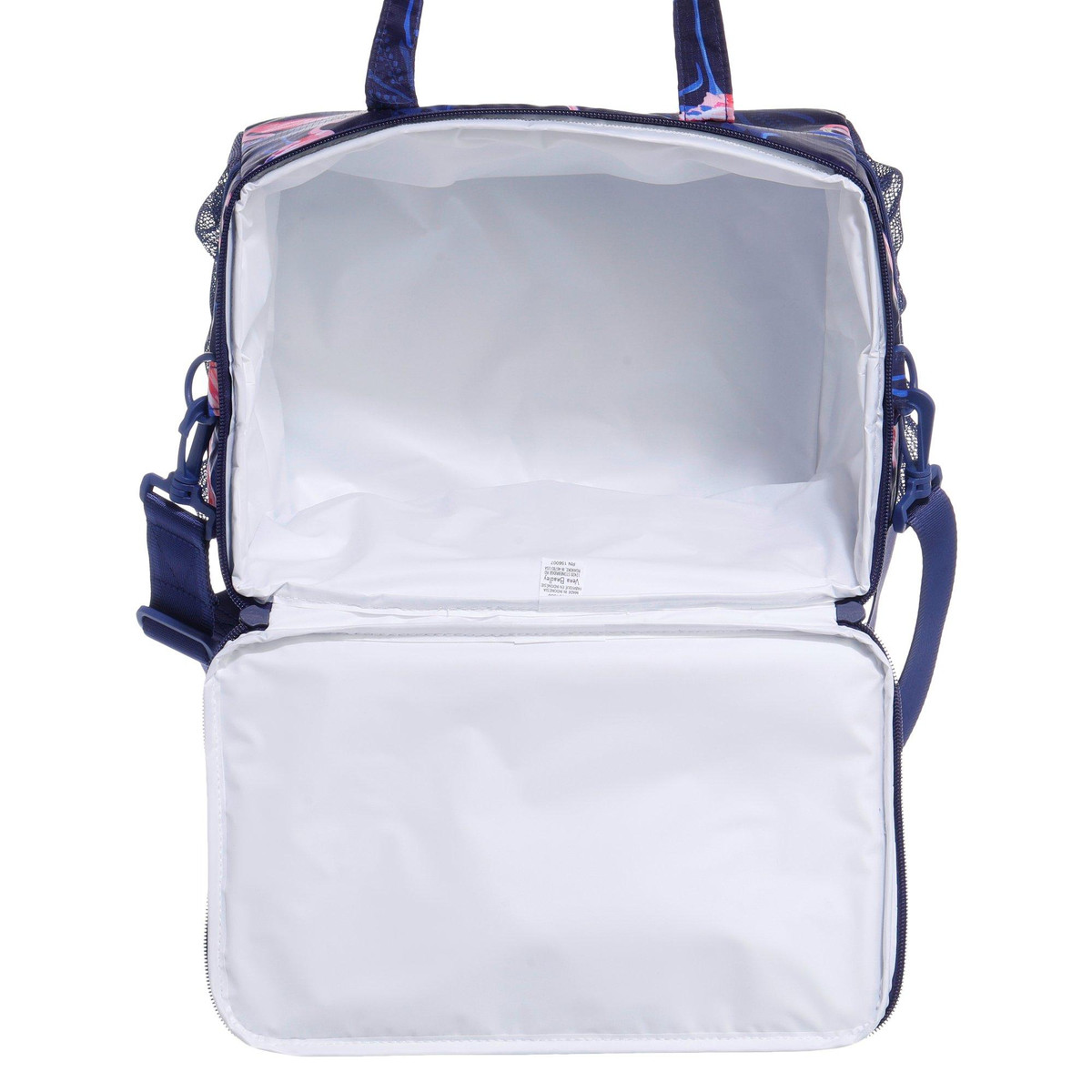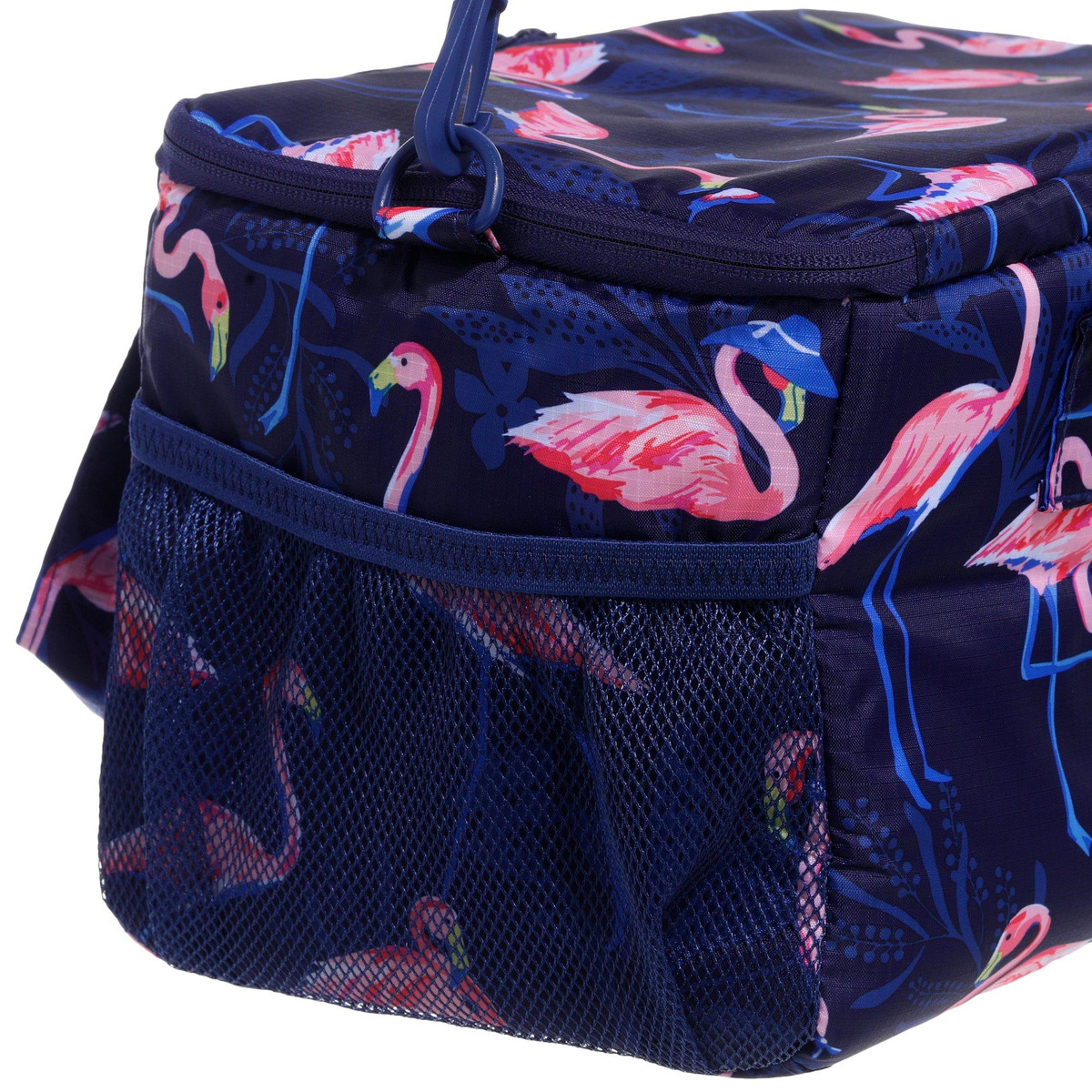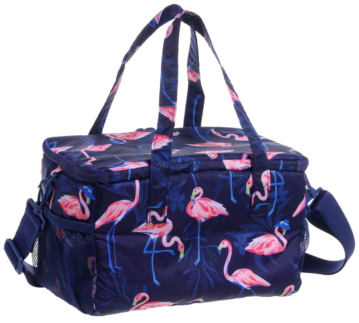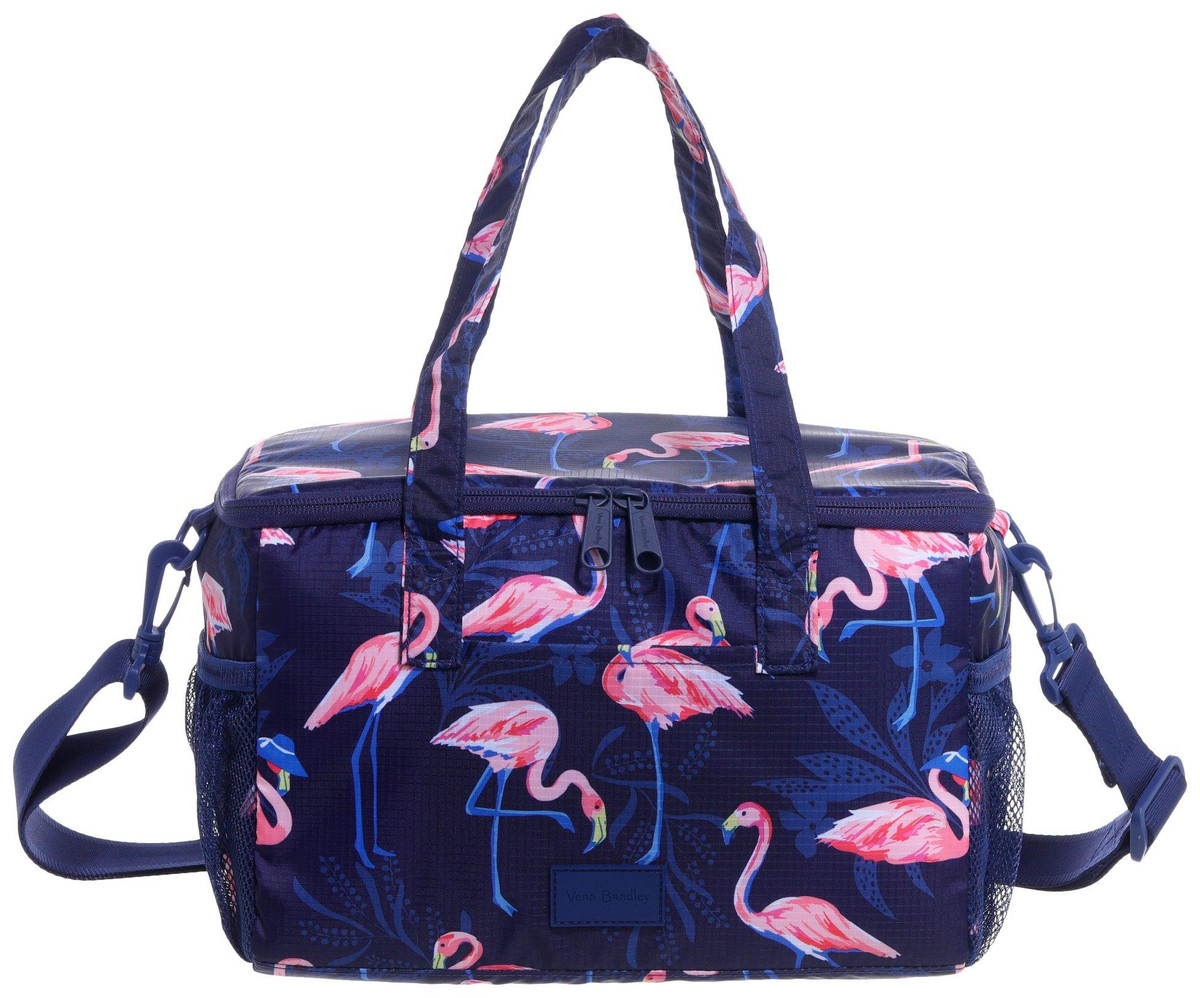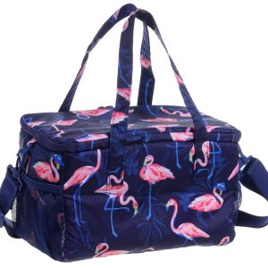 Keep your snacks and drinks cool in Florida style with the Flamingo Cooler in the fun, flamingo pattern featuring (2) exterior mesh pockets and 1) exterior nylon pocket. Also has an adjustable shoulder strap and two hand straps. Measures approximately 13 in x 8 in x 7 in.