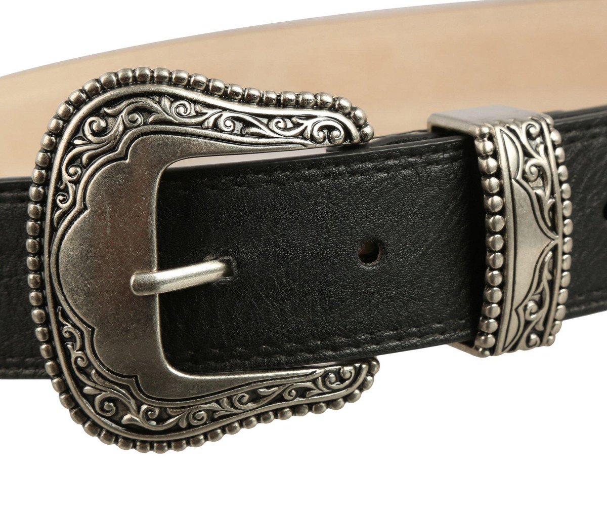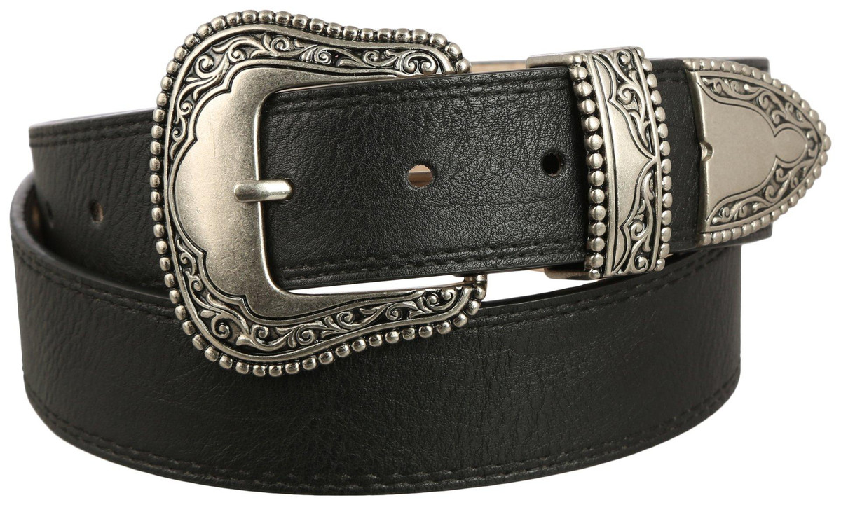 This Womens Belt features a solid color design on a vegan leather fabrication, partnered with a unique western-style metal belt buckle and accents. Belt measures approximately 1.5 in. wide. Buckle measures approximately 2.5 in x 2.5 in.
