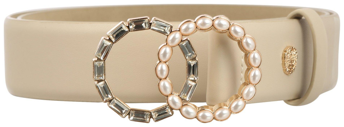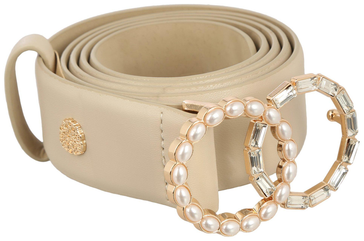 This Womens Belt features a solid color design on a vegan leather fabrication, partnered with a unique faux crystal and pearl belt buckle. Belt measures approximately 1.5 in. wide. Buckle measures approximately 2 in x 3 in.