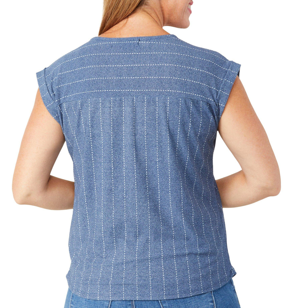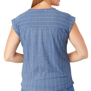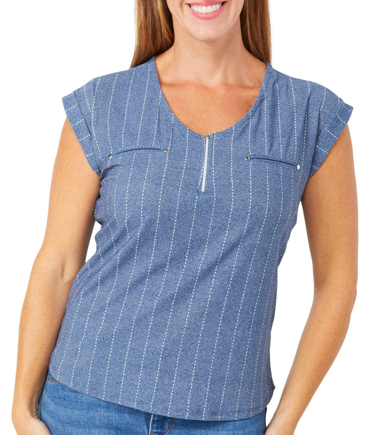 Refresh your everyday look with this Women’s Short Sleeve Zip Neck Top. Featuring a dotted stripe print, short roll cuff sleeves, faux chest pockets, and a sleek quarter zip neckline, it blends casual comfort with polished style. Great for work or weekend wear. Fabrication 96% polyester, 4% spandex