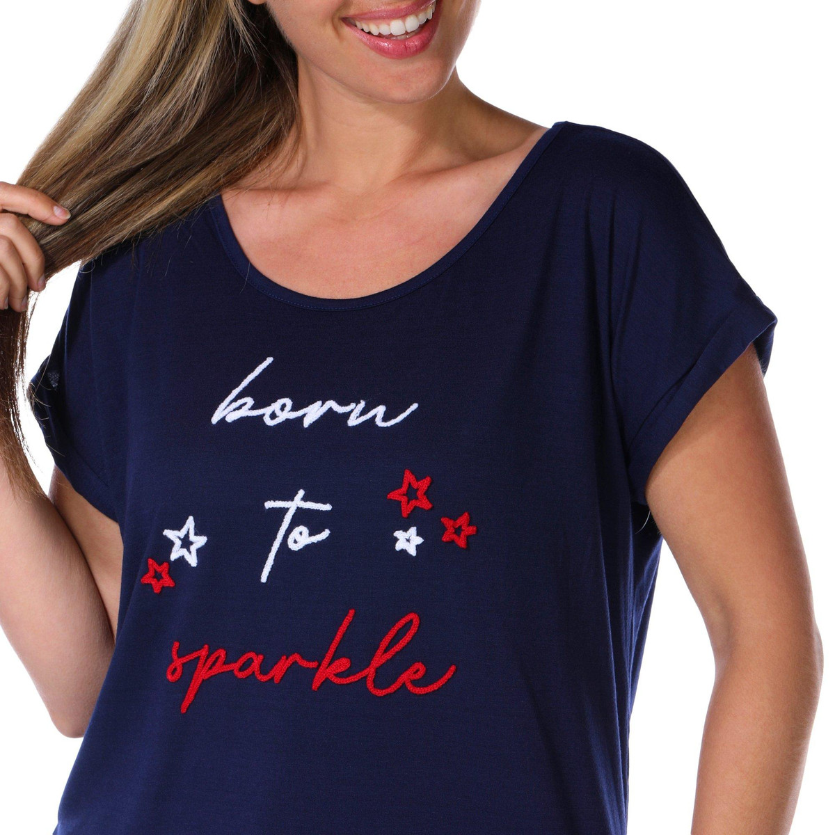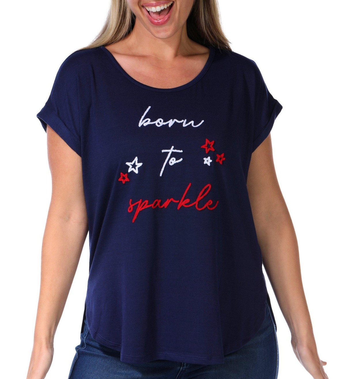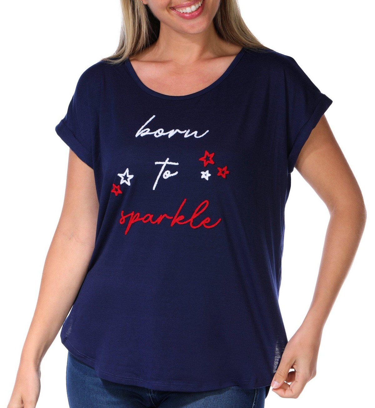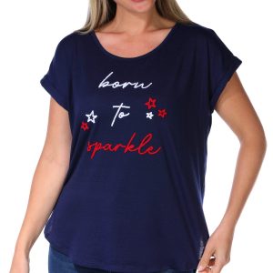 This women’s embroidered Born to Sparkle top features a scoop neckline and short roll cuff sleeves for a relaxed and stylish fit. The embroidered script adds a cheerful and festive touch, perfect for casual days with a hint of shine. Fabrication 97% polyester, 3% spandex