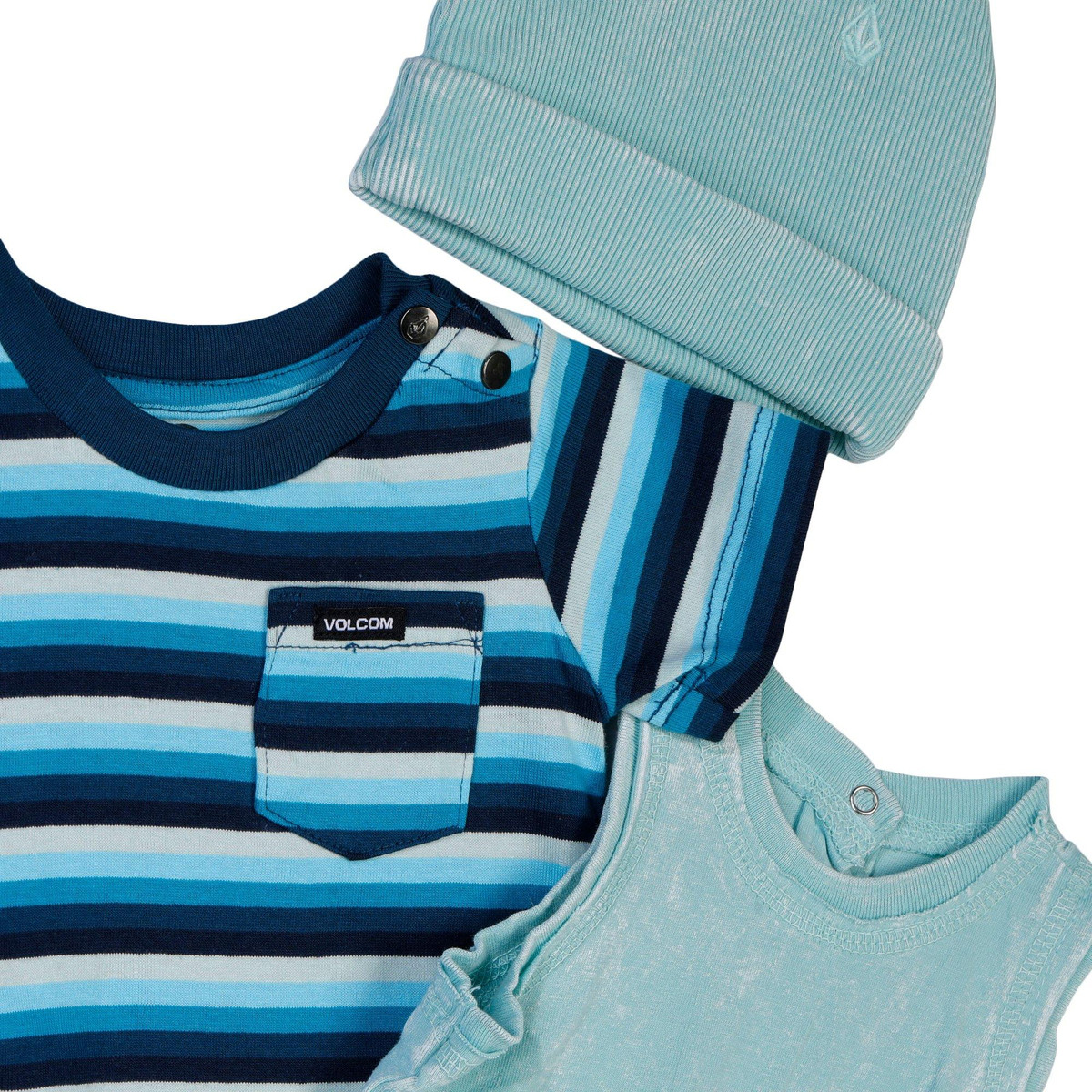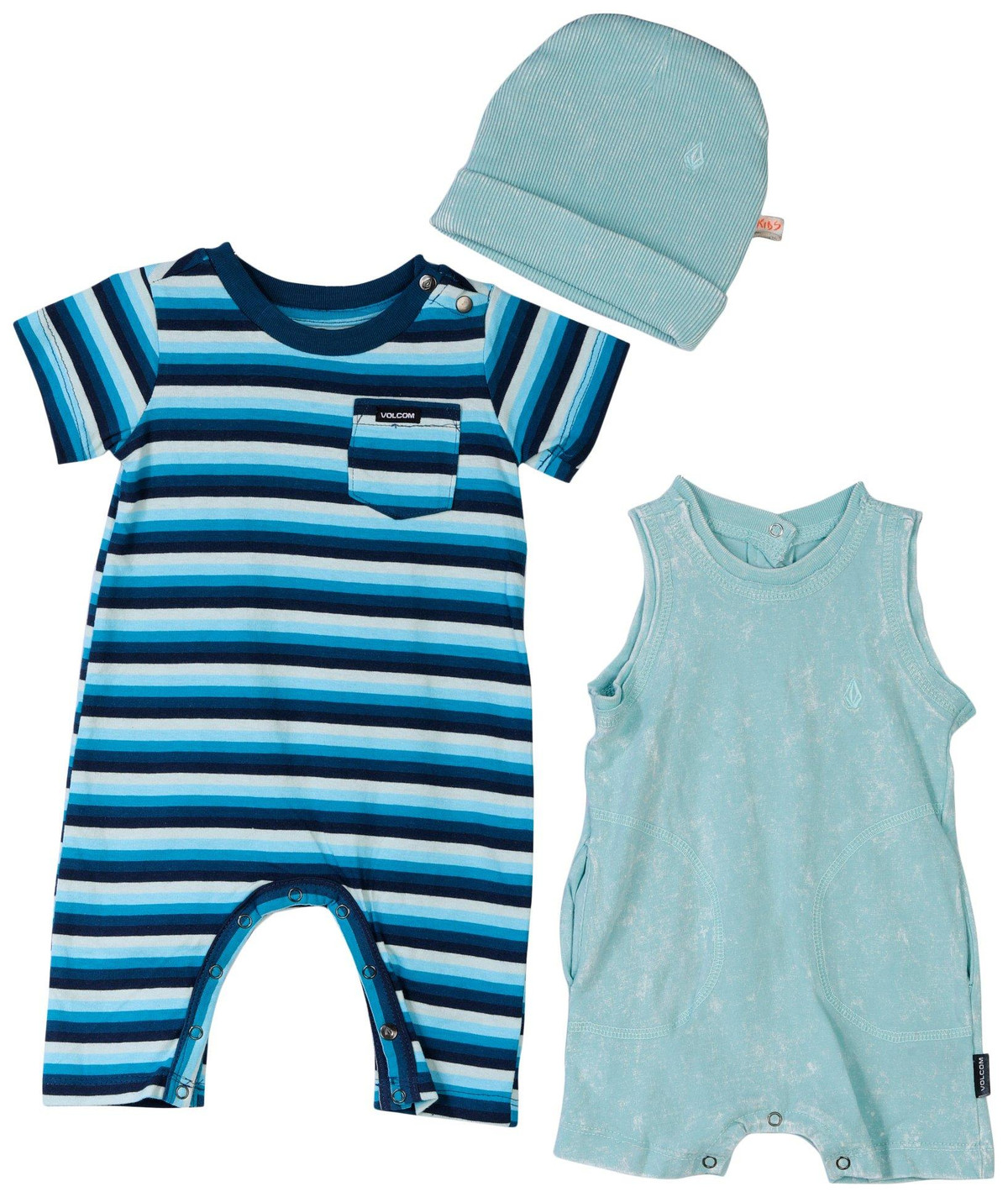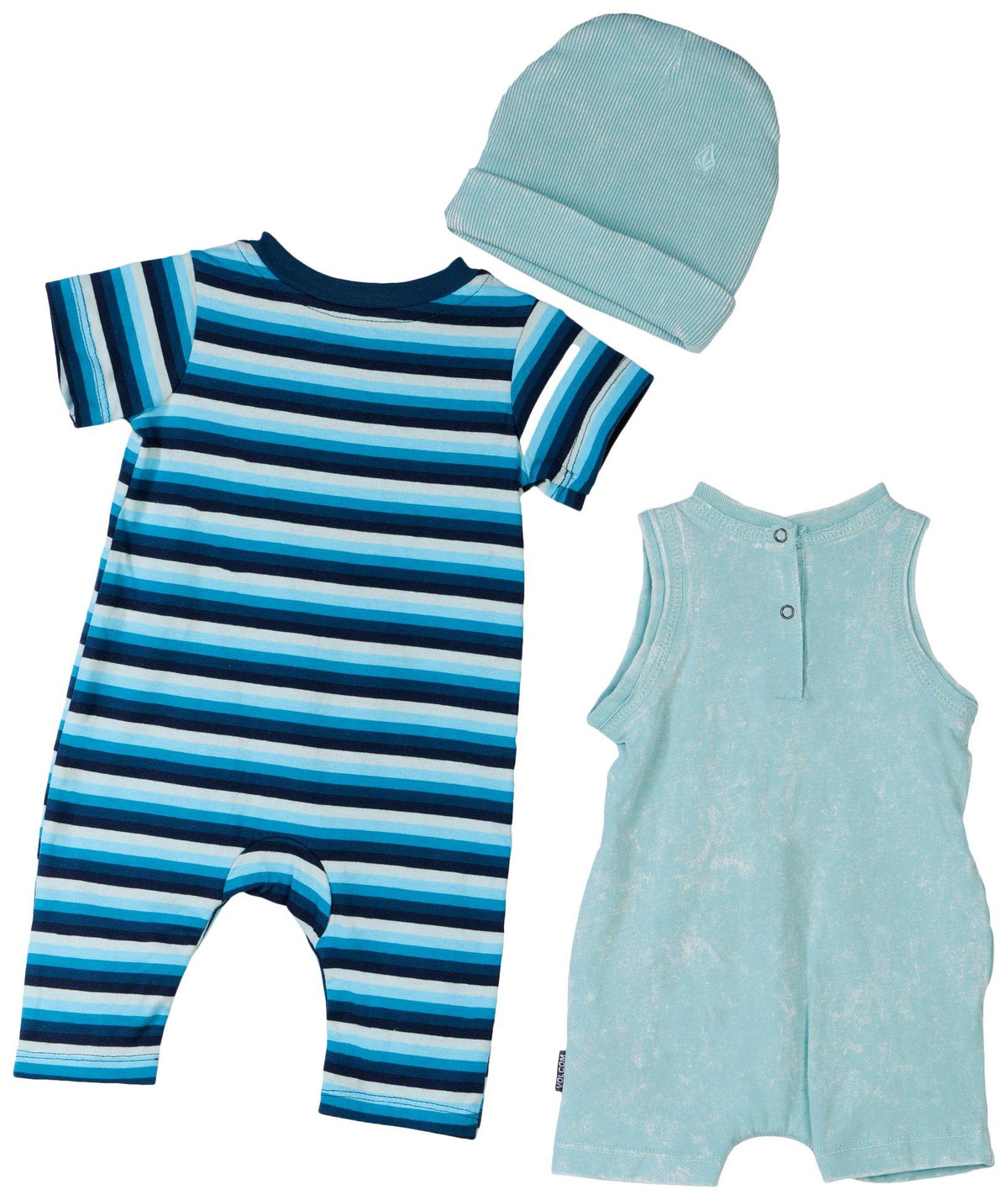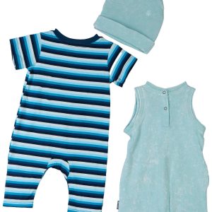 Keep little ones comfortable with the Baby Boys 3 Pc Stripe Solid Rompers and Hat Set, featuring a striped short sleeve long pant romper, a solid tank short pants romper, and a coordinating hat. Crafted for softness and ease of movement. Ideal for daily wear, playtime, and warm-weather outings. Fabrication is 100% cotton.