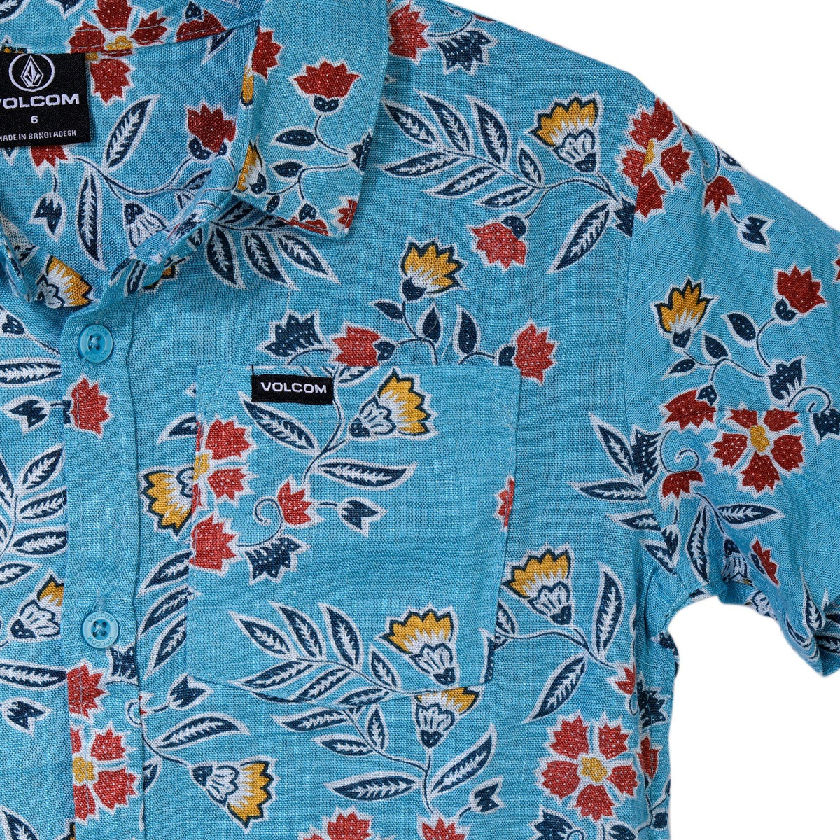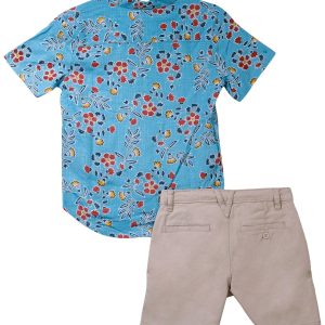The Volcom Boys Chino Woven Set combines style and comfort for any occasion. The blue button-down top features subtle flower accents in copper and yellow, adding a touch of laid-back charm. Paired with khaki light brown shorts, this set offers a classic look with practical details, including four pockets and a secure buttoned back pocket. With a 3 1/2-inch inseam, these shorts provide the perfect fit for all-day wear.
