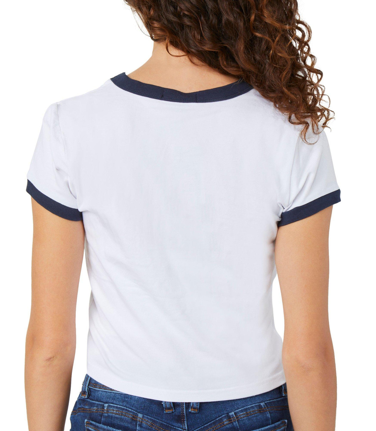 Keep it cool and classic with the Juniors Ringer Baby Tee. Featuring a cropped fit, embroidered logo script, and contrast navy piping on the crew neckline and short sleeves, this tee brings a sporty-chic vibe to your everyday look. Fabrication 95% cotton, 5% spandex