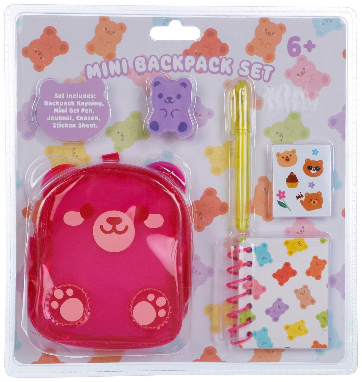 Bring playful style to backpacks with this Girls Mini Backpack Bag Charm with Stationery Set, designed with a colorful gummy bear design that adds charm and function. Includes a mini spiral notebook, gel pen, eraser, and sticker sheet, all featuring gummy bear themes. Perfect for school, party favors, or creative fun on the go. Wipe clean with a damp cloth. Safe for ages 6 years+.