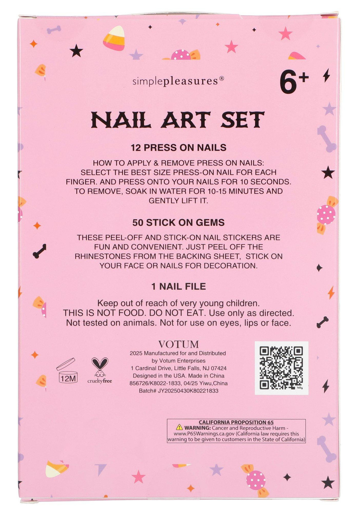 Encourage creative expression with the Votum Halloween Nail Art Kit. Featuring 12 Halloween-themed press-on nails, 50 stick-on gems, and a nail file, this set offers everything needed for festive nail styling. Designed for easy use and safe for ages 6 and up. Perfect for parties, dress-up, or seasonal fun. Store in a cool, dry place.