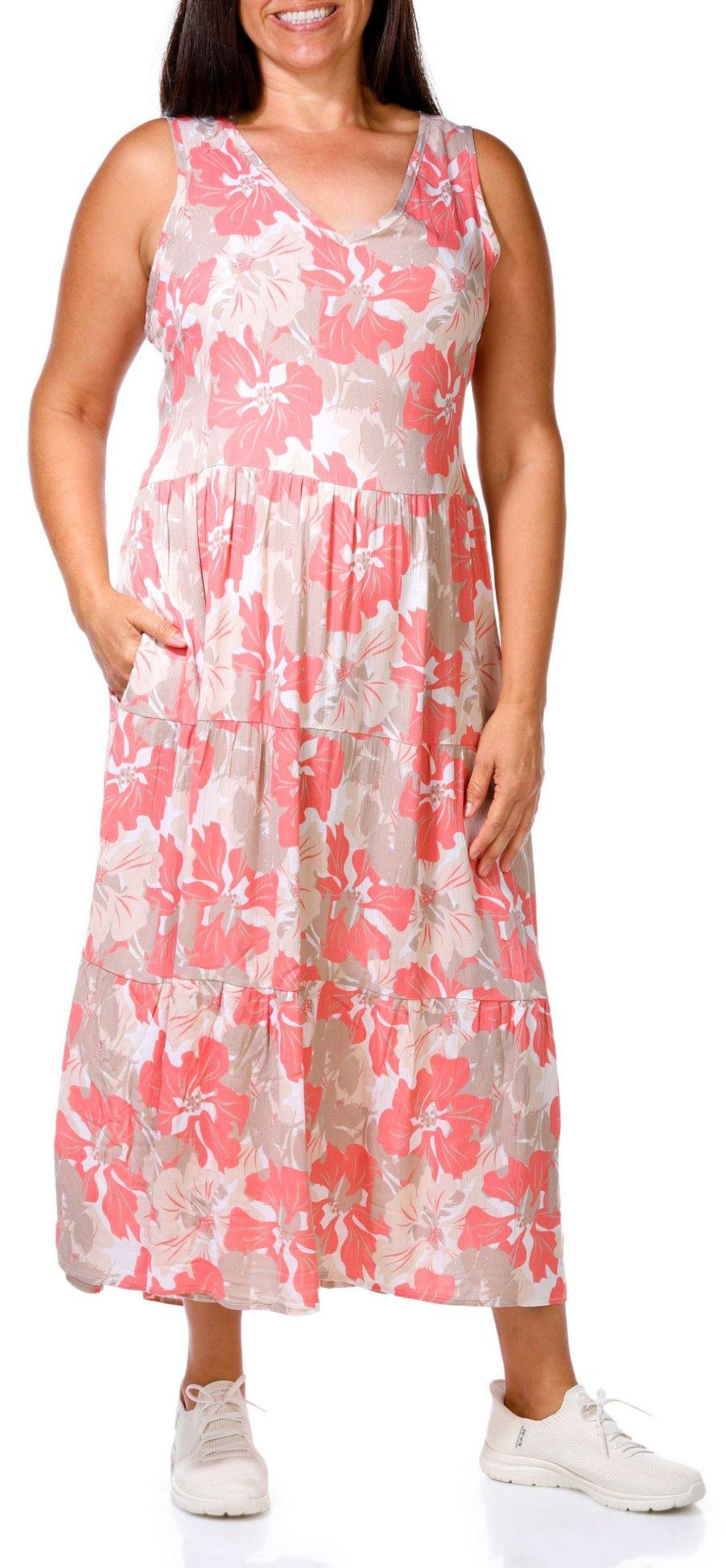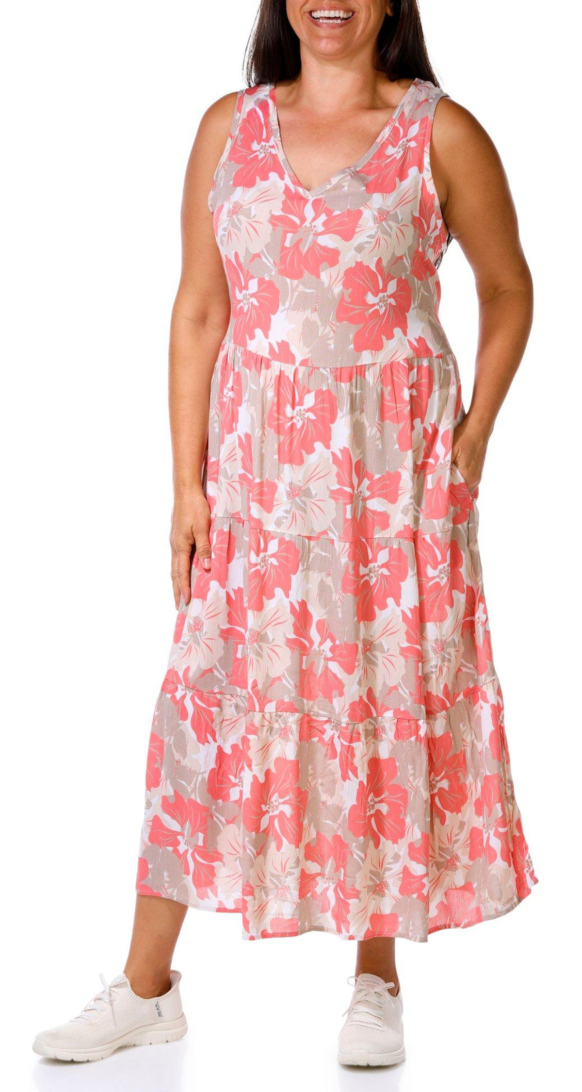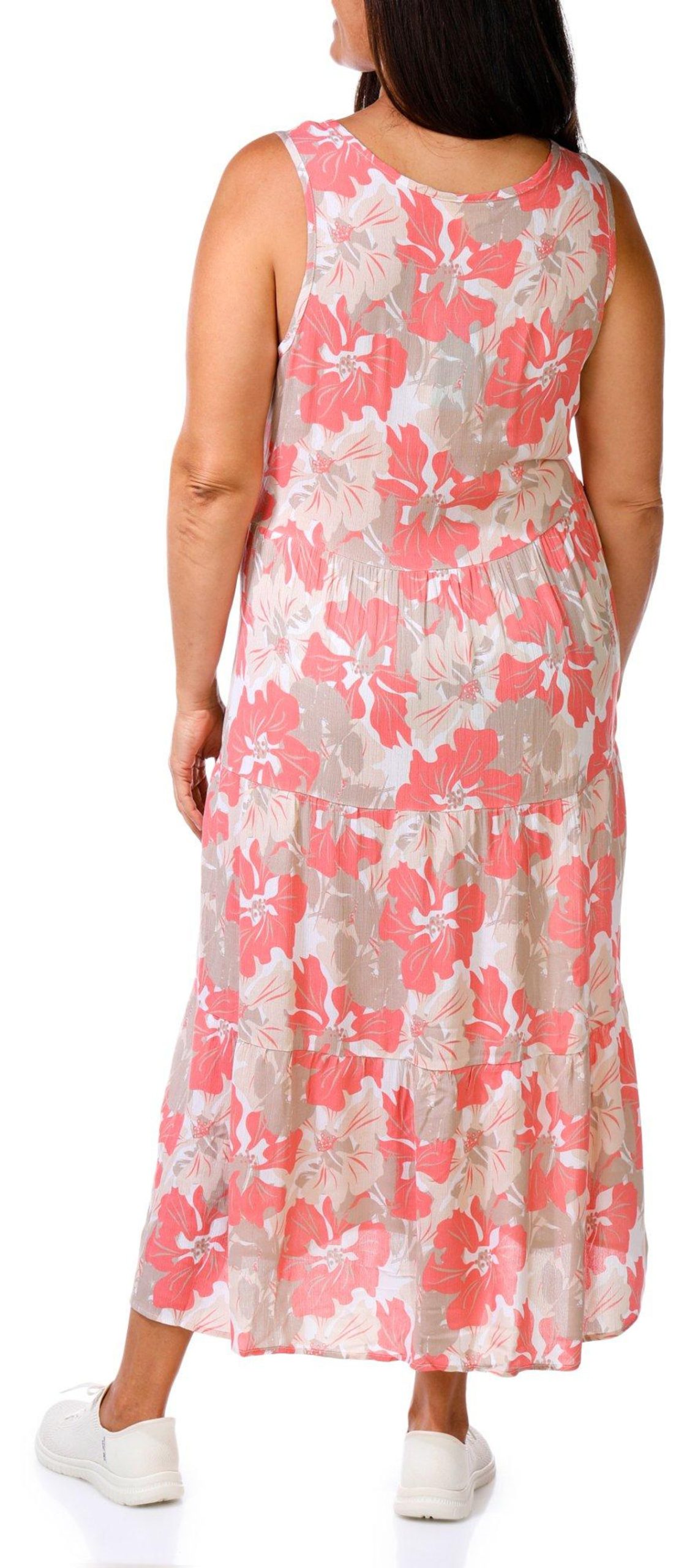 Introducing our Plus Sleeveless Floral Maxi Dress, crafted from 100% rayon for a soft and breathable feel. This elegant dress features a stylish floral design and a flattering V-neckline. With a modest maxi length, it offers a sophisticated silhouette perfect for any occasion.