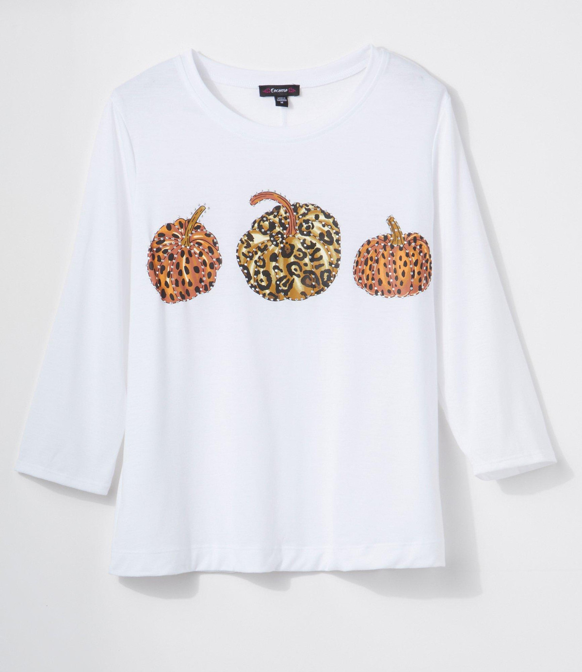 Make a fierce statement this fall with the Womens Embellished 3/4 Sleeve Pumpkin Animal Print Top. Designed with a sleek blend of 96% polyester and 4% spandex, it offers a smooth fit with just the right amount of stretch. The embellished pumpkin motif pops against a wild animal print backdrop, blending seasonal charm with untamed flair. Finished with flattering 3/4 sleeves, this top is perfect for pumpkin patch adventures, festive outings, or adding a little edge to your autumn wardrobe.