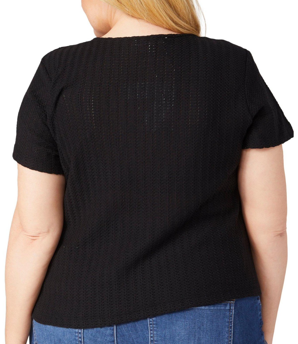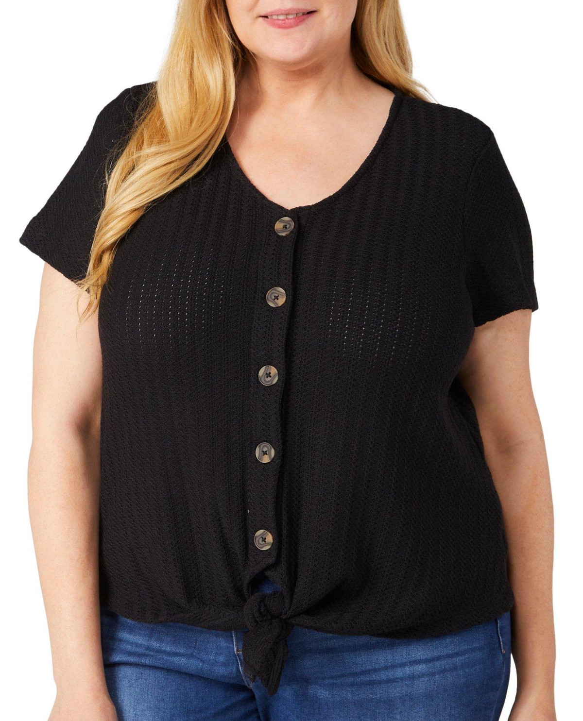 Add a touch of charm to your wardrobe with this Knit Short Sleeve Sweater. Featuring a classic buttoned front, this sweater combines elegance with comfort. The front tie detail adds a stylish accent, making it perfect for any occasion. Embrace the blend of sophistication and ease with this versatile and chic short sleeve sweater. Fabrication is 64% polyester, 36% cotton.