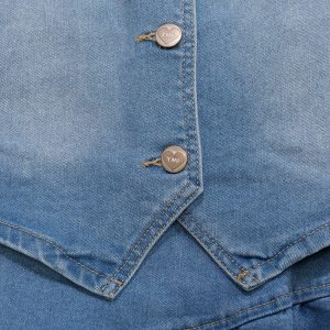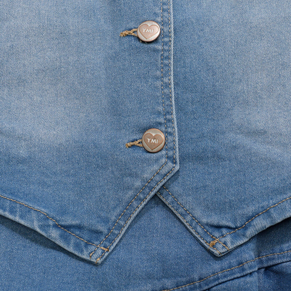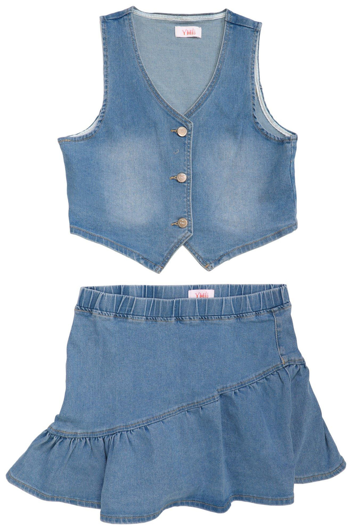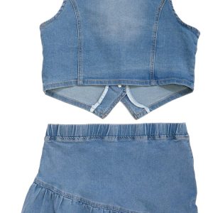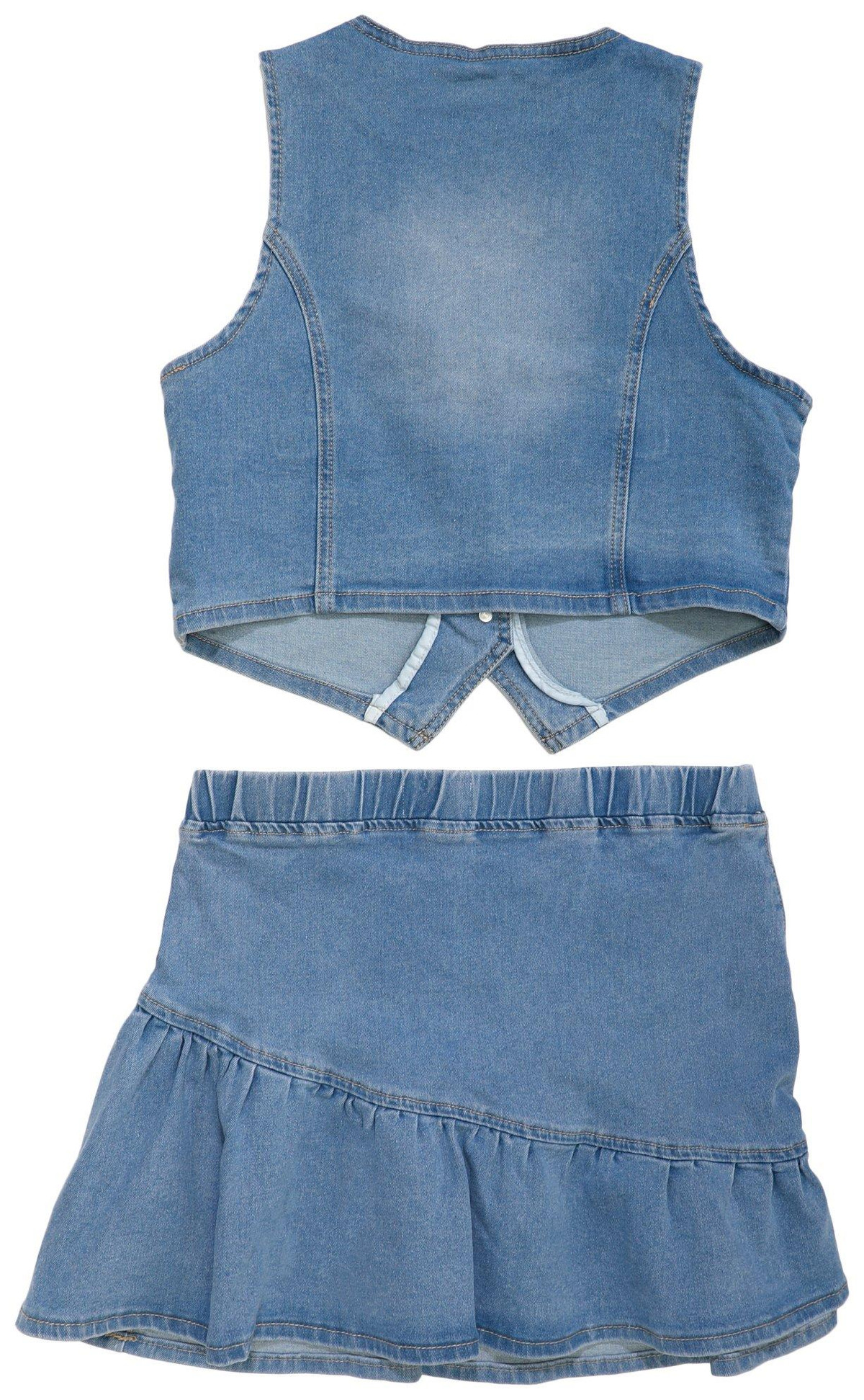 Add versatile style to her wardrobe with this Big Girls 2 Pc Denim Vest & Pull-On Skirt Set. The set features a classic metal-button vest paired with a comfortable pull-on skirt finished with a ruffle hem for a playful touch. Ideal for school, outings, or casual events. Machine washable for easy care.