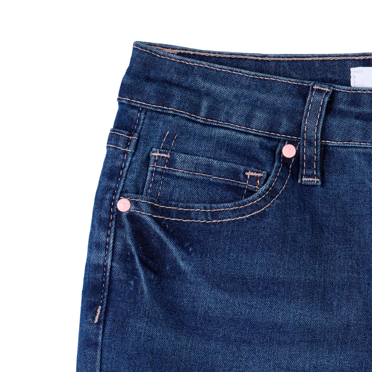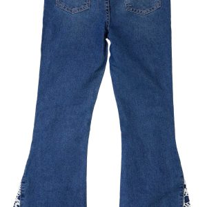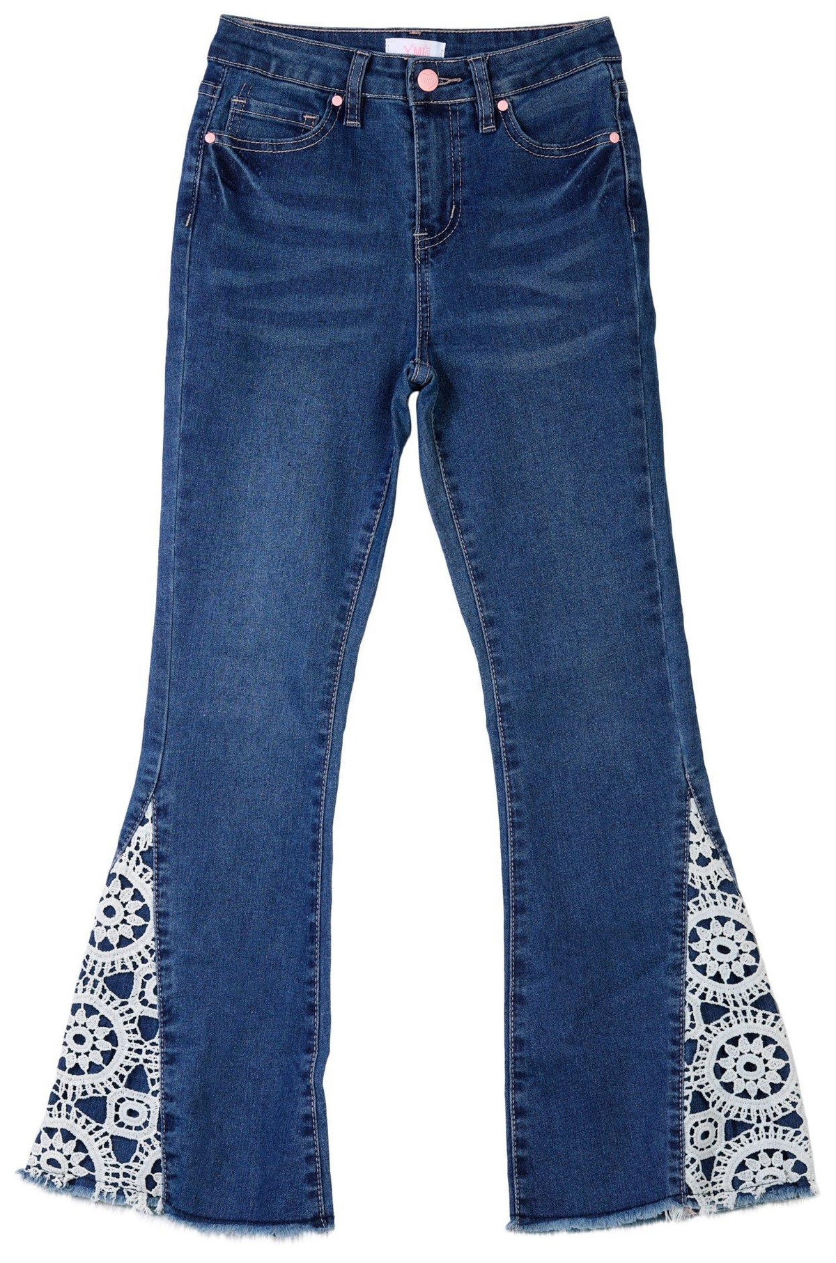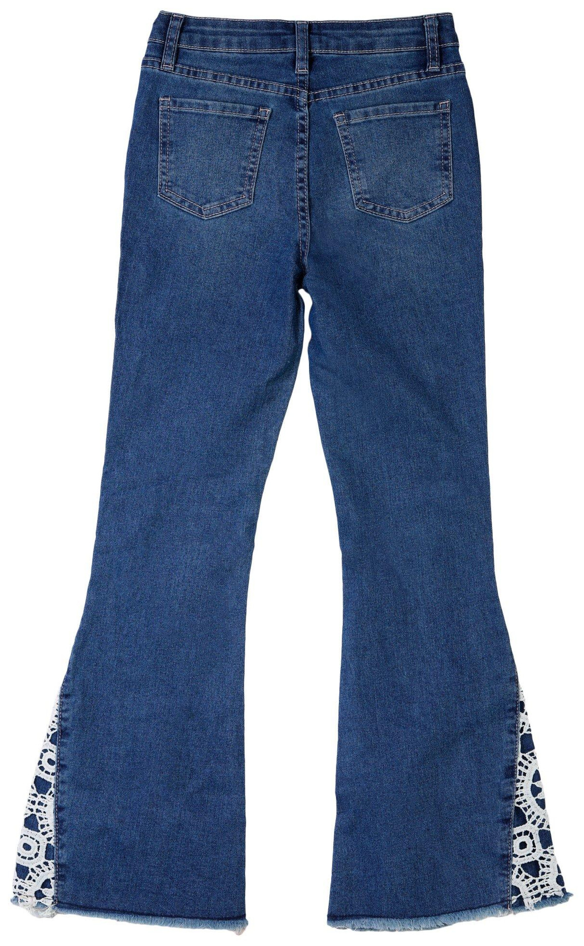 Add a touch of elegance to her wardrobe with these Big Girls Flare Lace Insert Denim Jeans Pants. Designed in a dark denim wash, these jeans feature crochet lace inserts at the flared hems for a stylish finish. The classic five-pocket design and stretch denim provide both comfort and versatility. Ideal for casual outings or special occasions. Machine washable for easy care. Fabrication is 62% cotton, 24% polyester, 10% Lyocell.