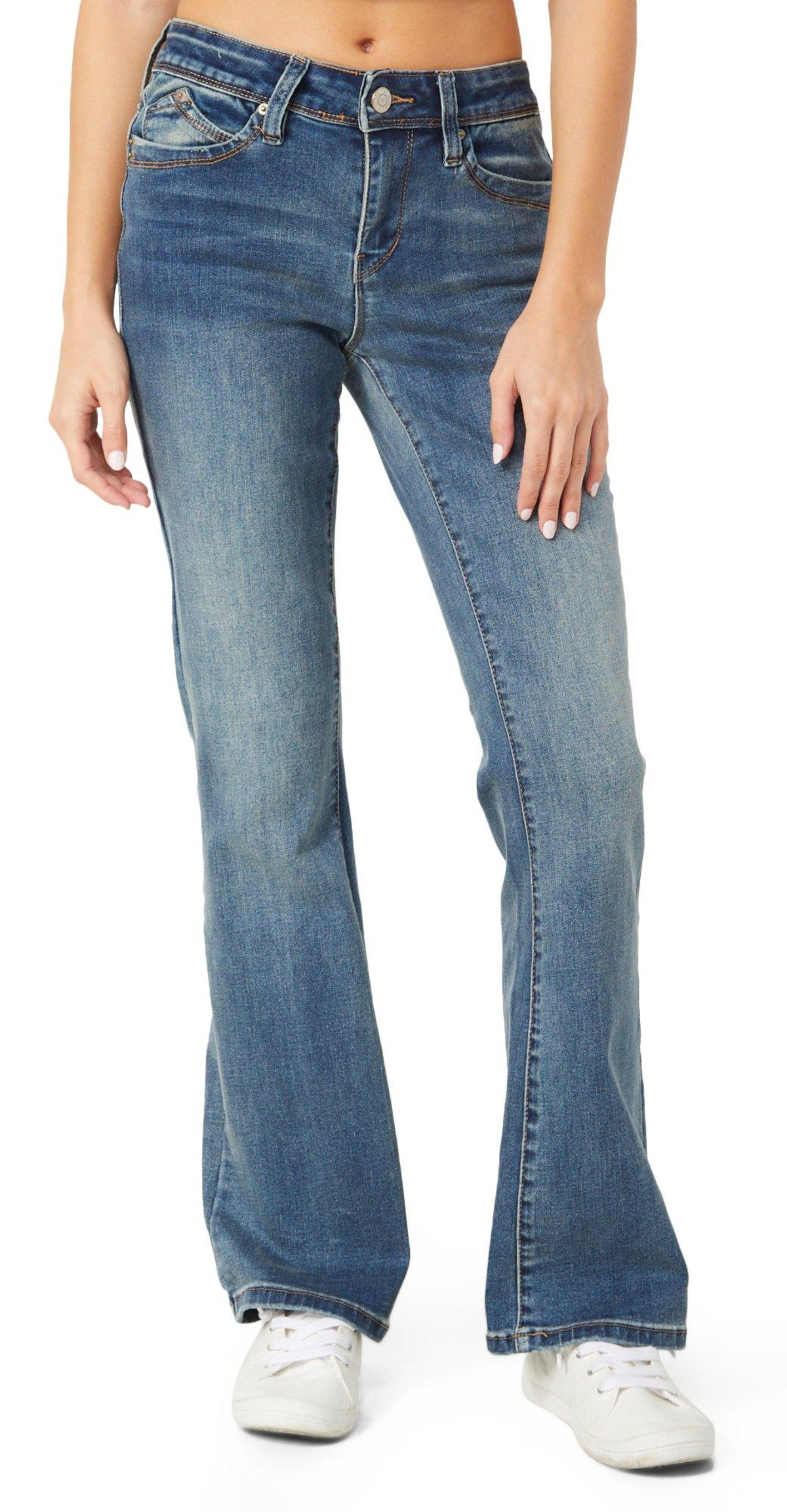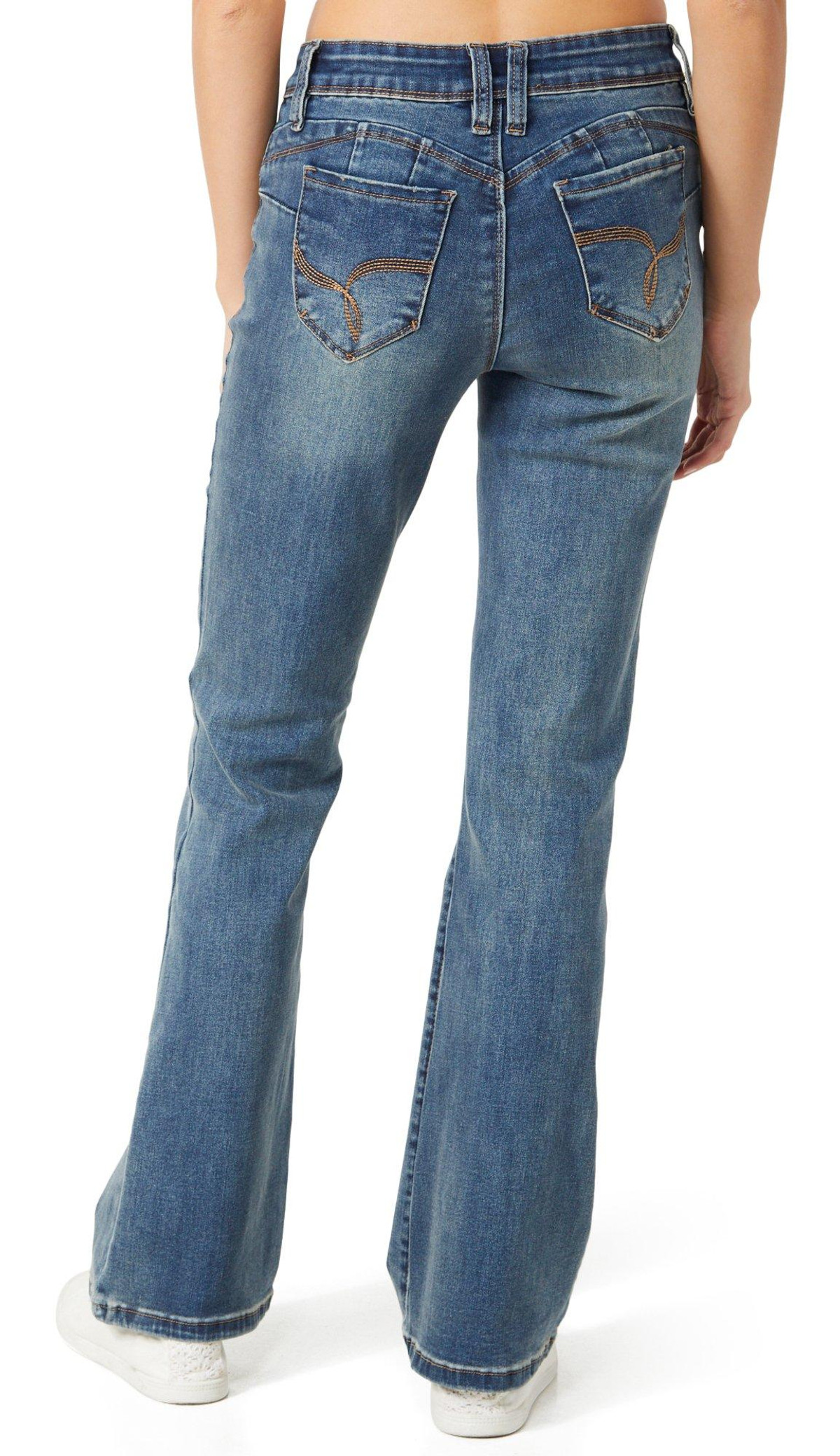 A timeless staple, the Juniors Mid Rise Boot Cut Jeans feature a flattering mid-rise fit, classic 5-pocket cut, and boot cut leg for a balanced silhouette. Perfect for everyday wear with a touch of retro flair. Fabrication is 66% cotton, 27% polyester, 2% spandex.