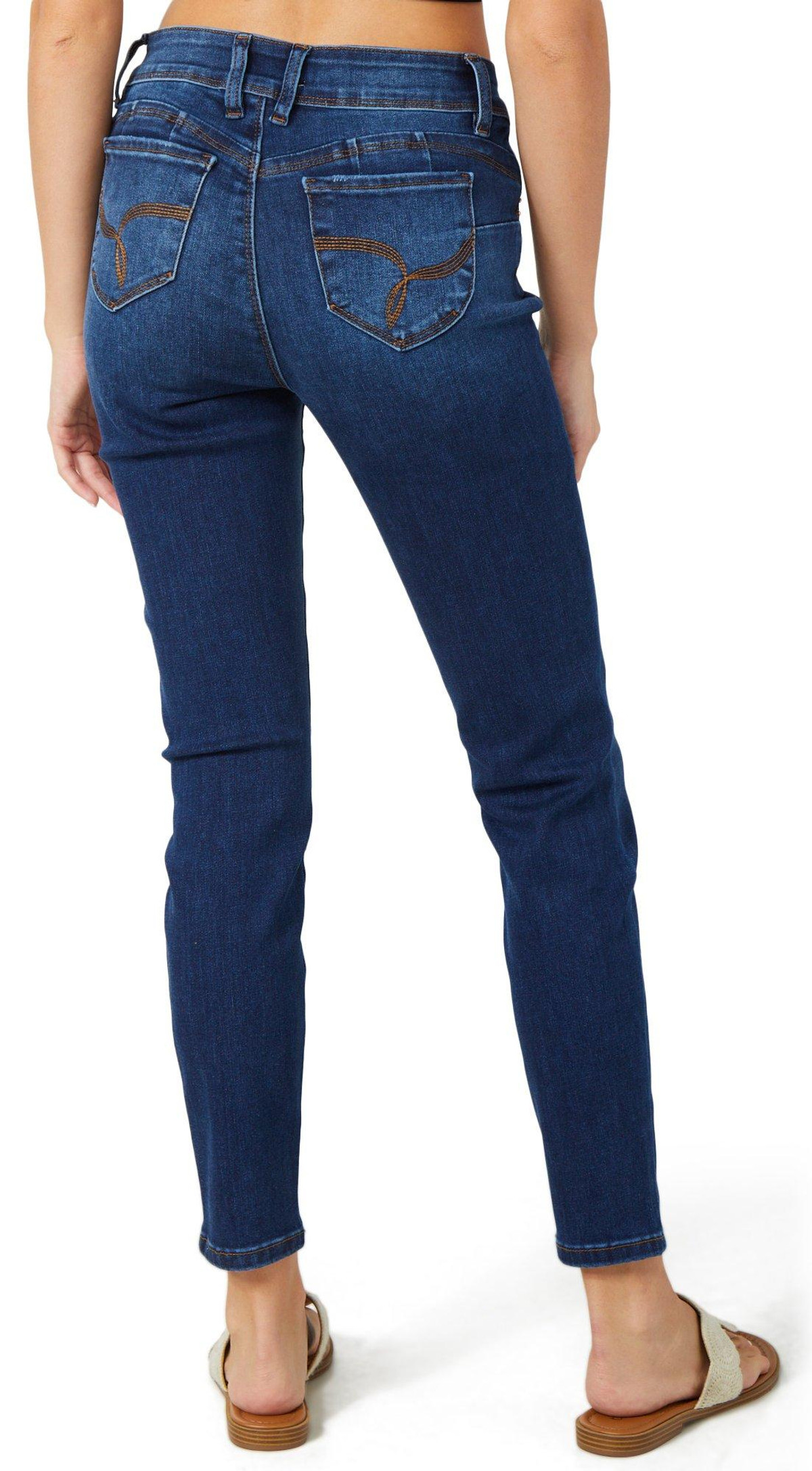 Sleek and versatile, the Juniors Mid Rise Skinny Jeans feature a classic 5-pocket cut and button-fly zip closure. With a flattering mid-rise fit and streamlined silhouette, theyre perfect for everyday wear and easy styling.