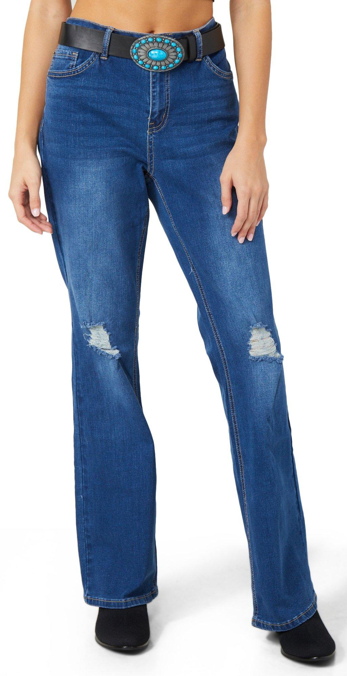 Make a statement with the Juniors Turquoise Belt Boot Cut Jeans. Featuring a classic 5-pocket cut, button-fly zip closure, and flattering boot cut fit, these jeans are elevated by a bold turquoise gem belt for a standout look.