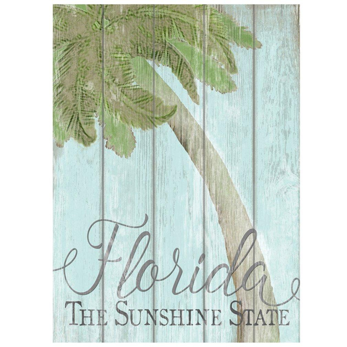 This charming 24-inch wood Sunshine State wall art features palm tree in light blue hues. Crafted from high-quality wood. The style of the wall art is reminiscent of coastal or beach-themed decor, suitable for adding a touch of Florida charm to any living room. size: 24 x 18 inches