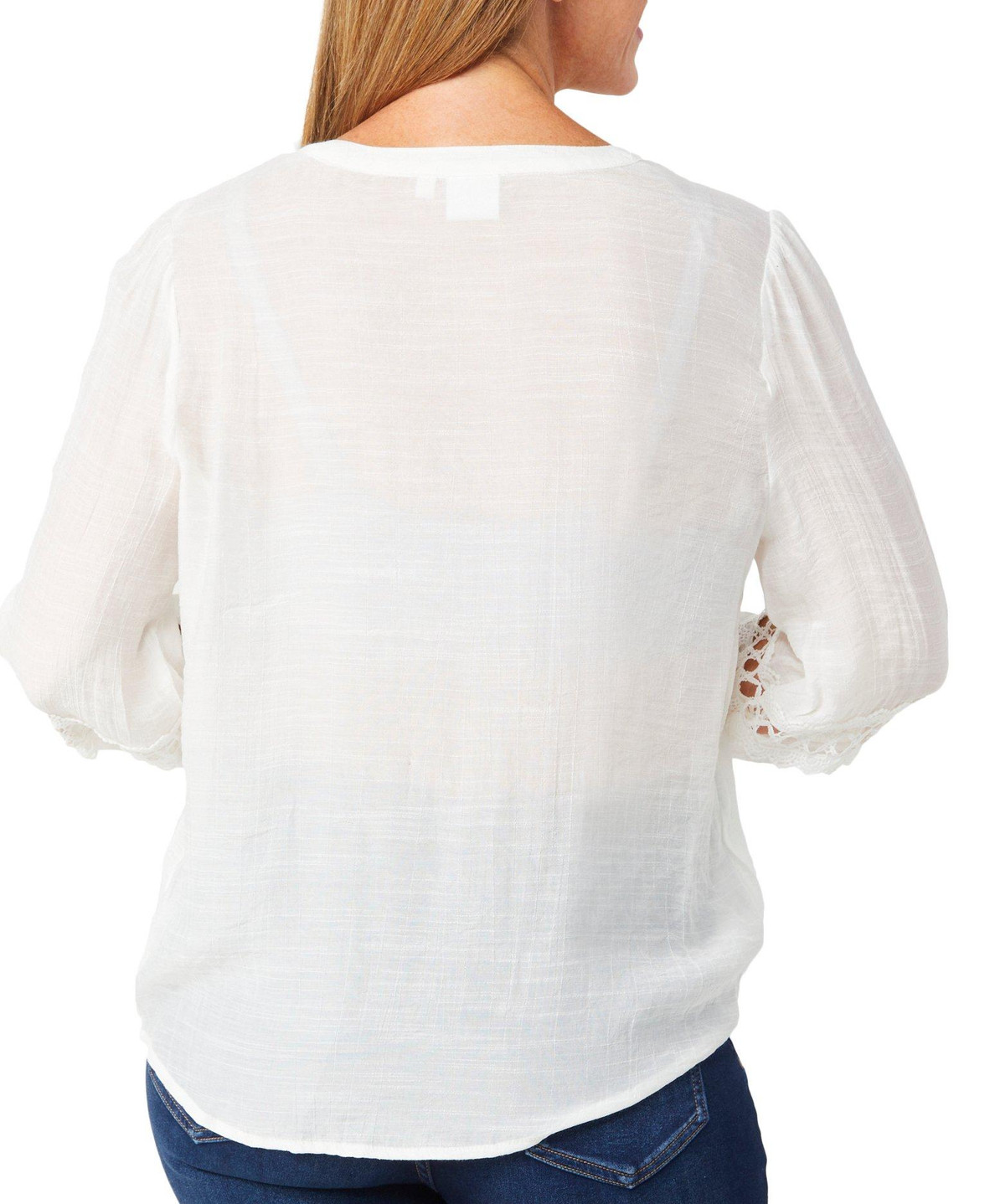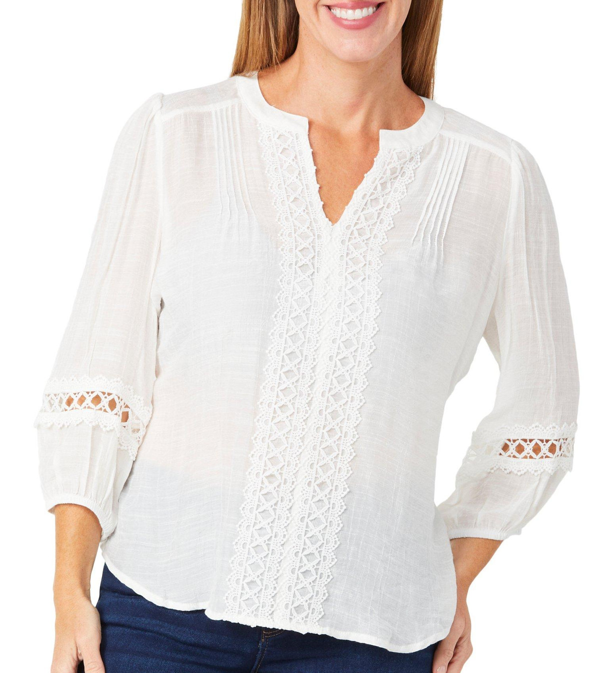 This women’s 3/4 sleeve top exudes effortless elegance with its sheer crochet slub fabric and delicate lace detailing. Lightweight and breathable, its perfect for layering or wearing solo for a romantic, boho-inspired look. The intricate textures add charm, making it ideal for both casual outings and dressier occasions. Fabrication is 65% rayon and 35% polyester.